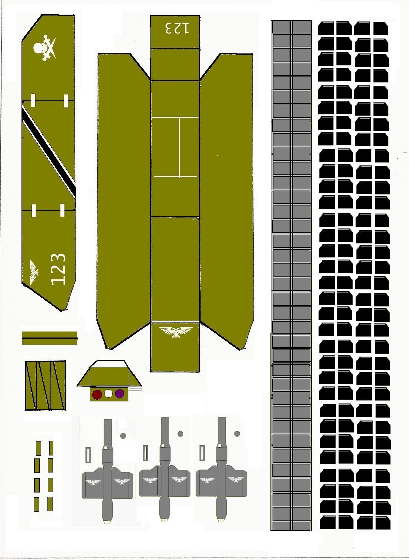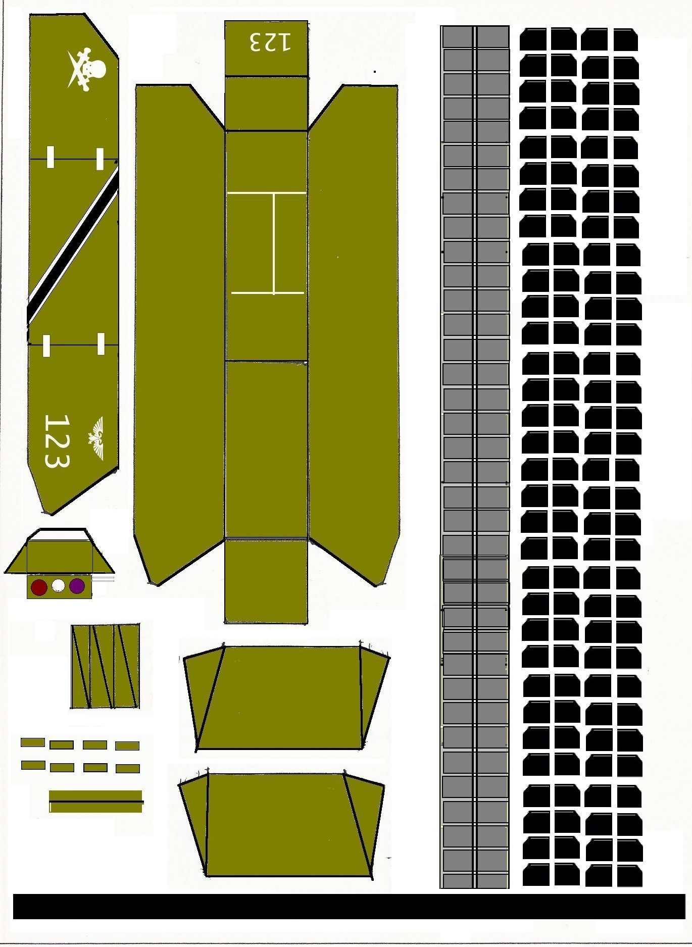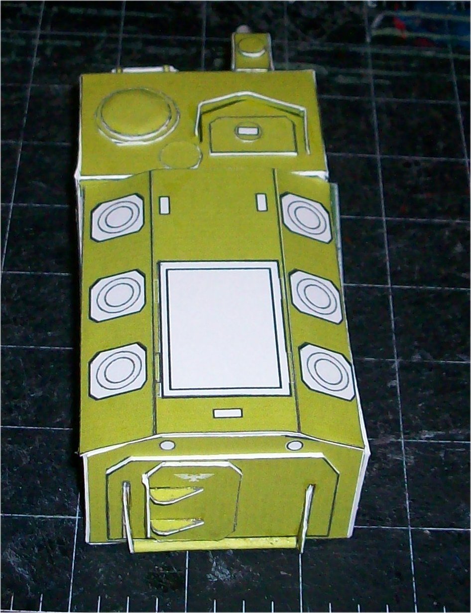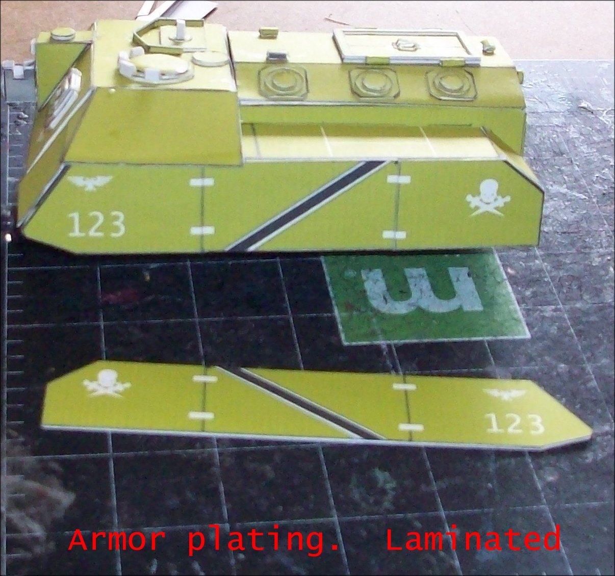 This Chimera is a basic chassis upon which I will design a Las cannon turret and Hunter Killer front later in the future. All of my models are strictly done in paper, But the same technique can be applied to sheet styrene. I have other models in my inventory but they are not game pieces, such as the Batman Tumbler and a series of Galactica Vipers and the Raptor. following is the build thread for the Super Chimera. The first pic is the finished model.
