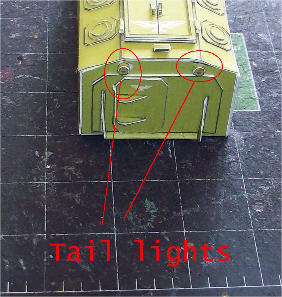 Tail lights are made by cutting a piece of paper stick from an ear swab (Q-Tip). Wrap the small strip around it and then place the lens section on the end and glue to the rear. I placed mine at the top but you can place them anywhere you want.