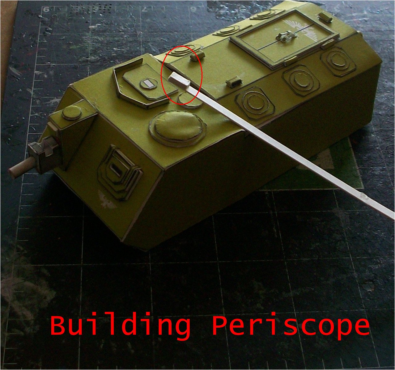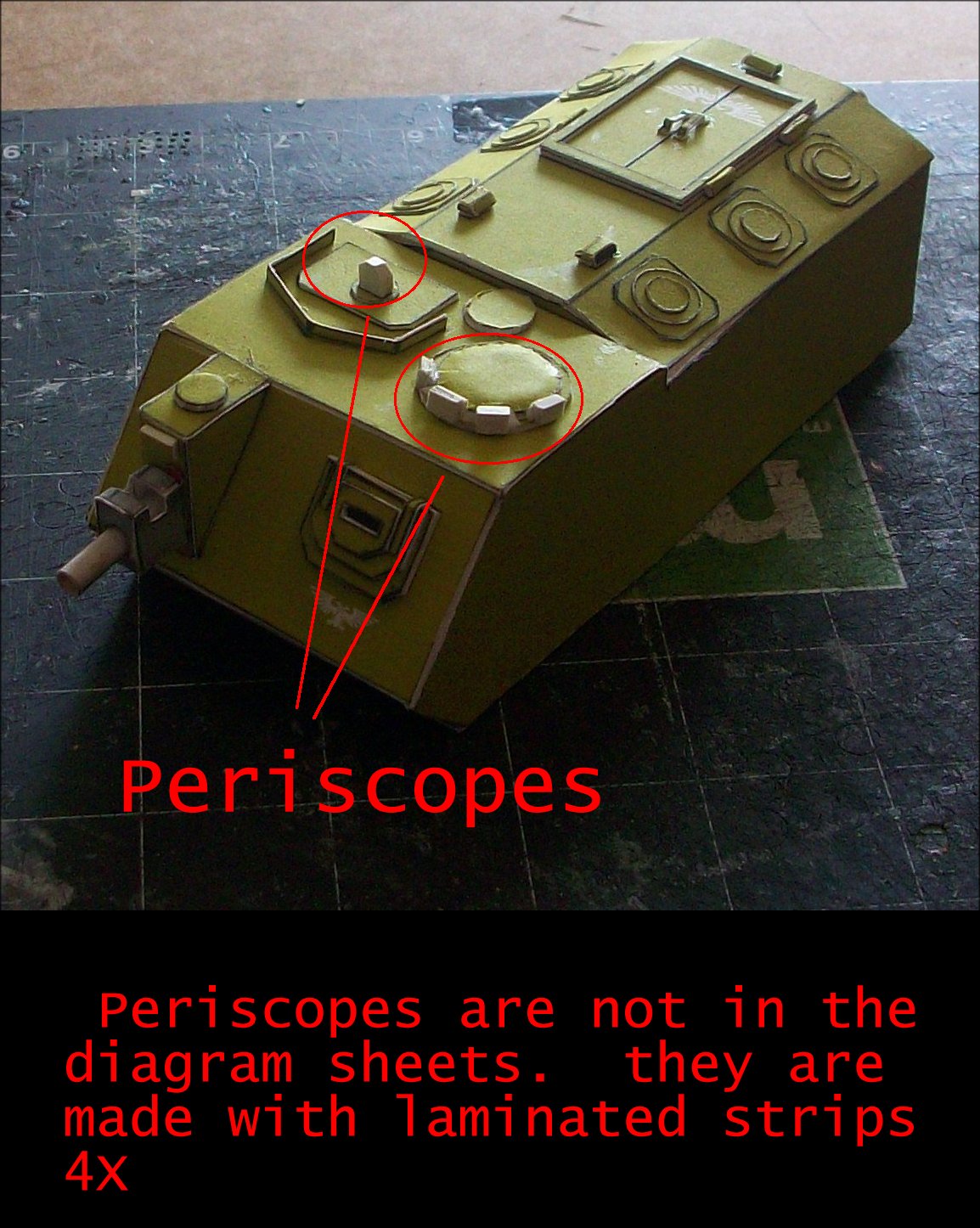 On the periscopes, they are not in the plans and the one over the cannon is optional. You can use the long one instead of the short one over the cannon hatch.