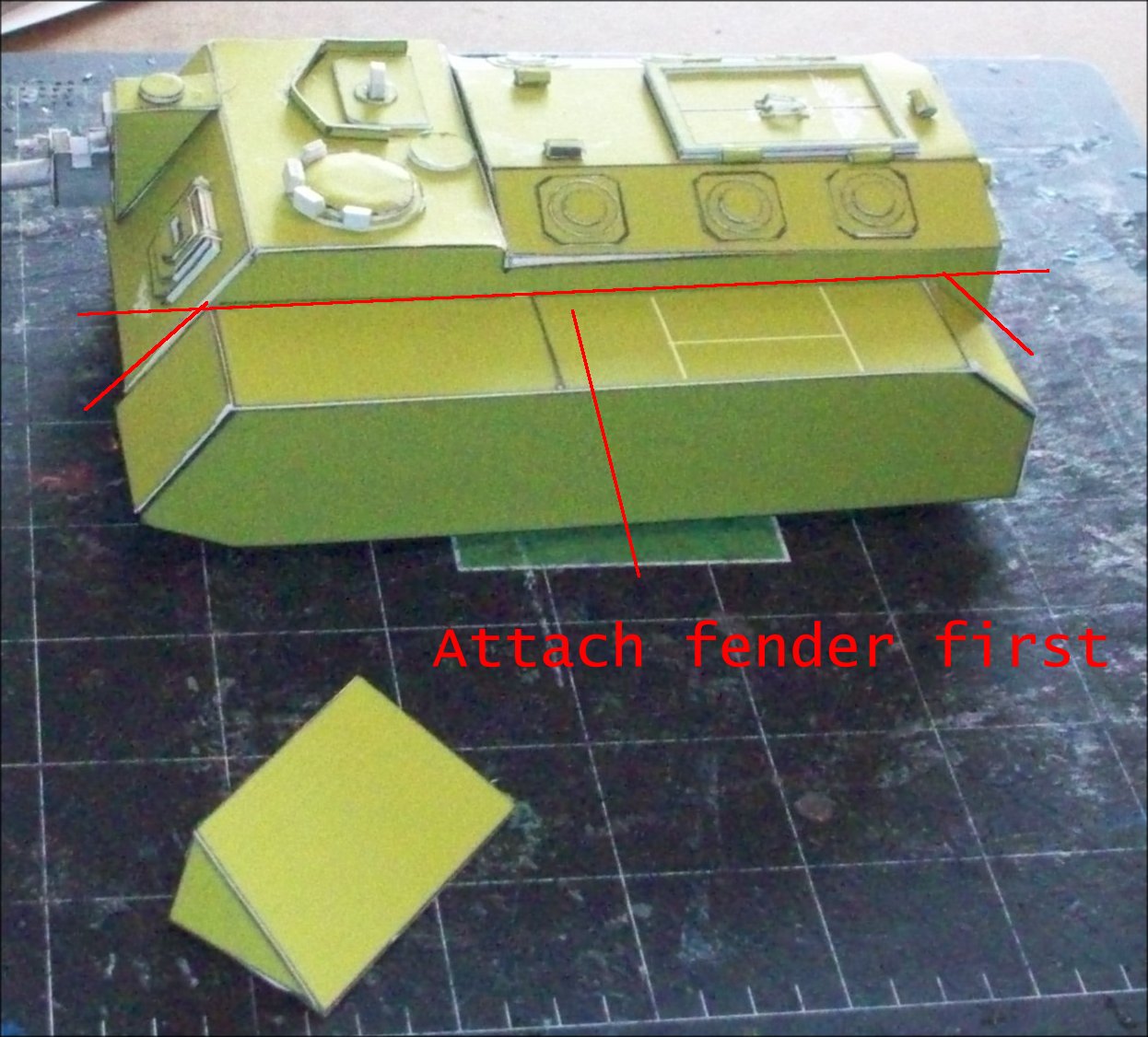 Next up, the side track covers. The angled sponson is a little large but this is to compensate for the laminated skirt. When that is in place and the glue sets, trim of the excess.