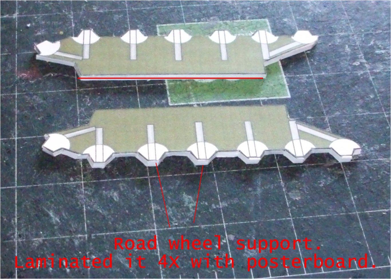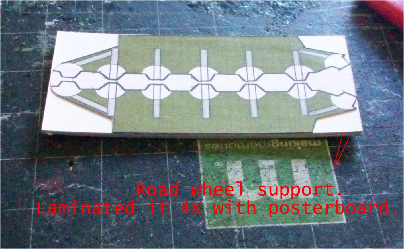 And now for the continuation of my build.... This is the roadwheel support. The difference between this and other armor vehicles, is that the main support for the wheels is on the center portion of the support. The wheels are not attached to the hull like in a traditional vehicle. The plans have a strip for the thickness of the center support. You need to laminate this part to the thickness indicated. This way the wheels are separated and can allow for the track guide to be used. On this model I did not make the guides but they can be made. I did them on the Beta build but I decided not to on the final build.