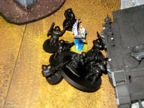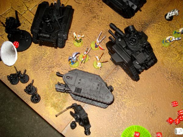 With a cry of "Burn the xeno filth!" my platoon leader and his squad open up on the warp spider squad, roasting all but one model alive. Meltagunners attempt to kill the farseer's squad, but only manage to take out one model, while the Leman Russ' plasma sponsoons destroy another warlock.