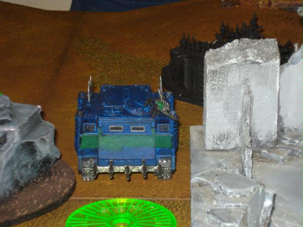 PCS in it moves in front of the Leman Russ and pops smoke. The Leman Russ shoots one of the Wraith Guards, and hits dead on, scoring a wound on the