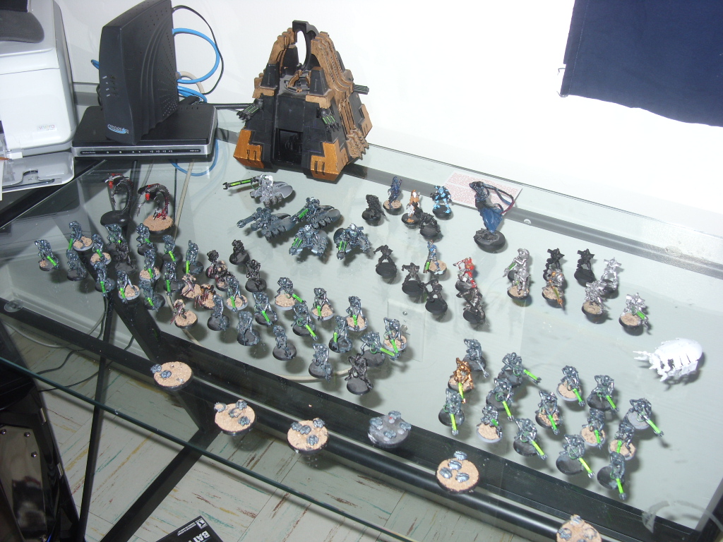 I have about 20ish warriors 9 or so destroyers, 1 heavy destroyer, 1 lord with res orb, lord w/ destroyer body res orb, 15 scarab swarms and a night bringer. Most of the warriors have been painted but can be stripped or if they were painted have been stripped, 3 destroyers are about half painted and the rest are either stripped or unprimed, heavy destroyer is unprimed, lord w/res is half painted, lord w/ destroyer body and res orb unprimed, scarabs are painted and flocked and glossed, night bringer is unprimed. If interested I will post or PM pics tonight.