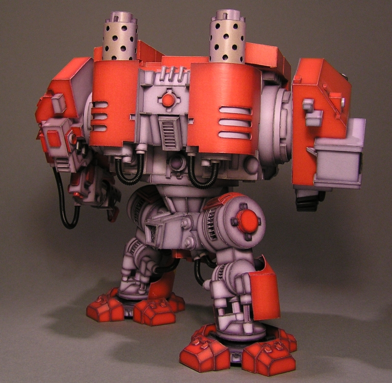 This is one of my Dreadnaughts. It is scratched built and made of paper cardstock. The same weight paper that you use for business cards. I got the plans from another site that deals mainly to the paper model side of the family, but they do have some plastic models as well. zealot.com. Some of the posters there are also involved in the 40K universe and visit this forum every now and then. It is amazing what can be done with paper. Some models are not cheap, considering the price of heavy paper and ink. Many models have 6 to 10 pages and some upwards of 40 pages. That is a lot of ink, even at a printers shop.