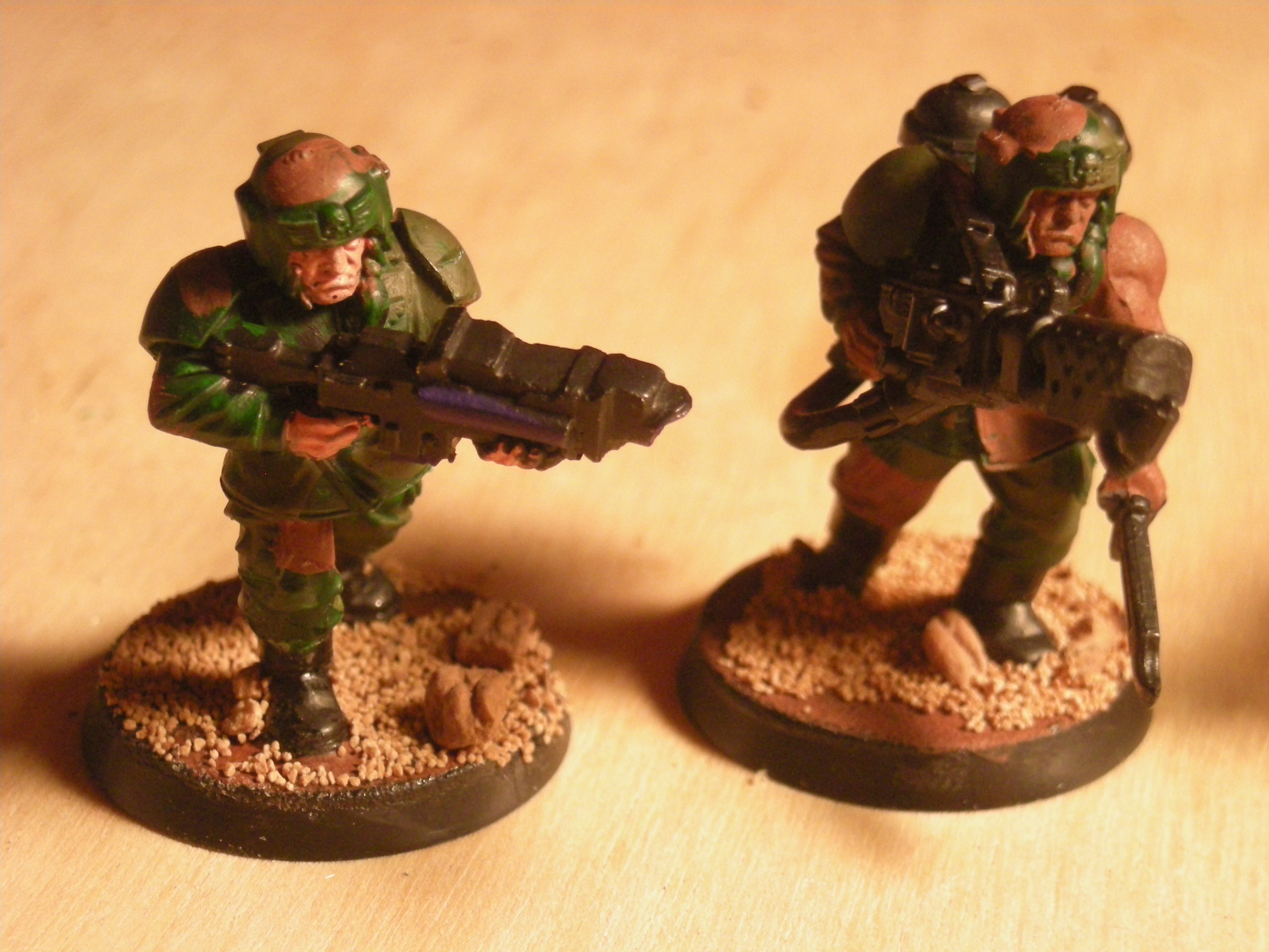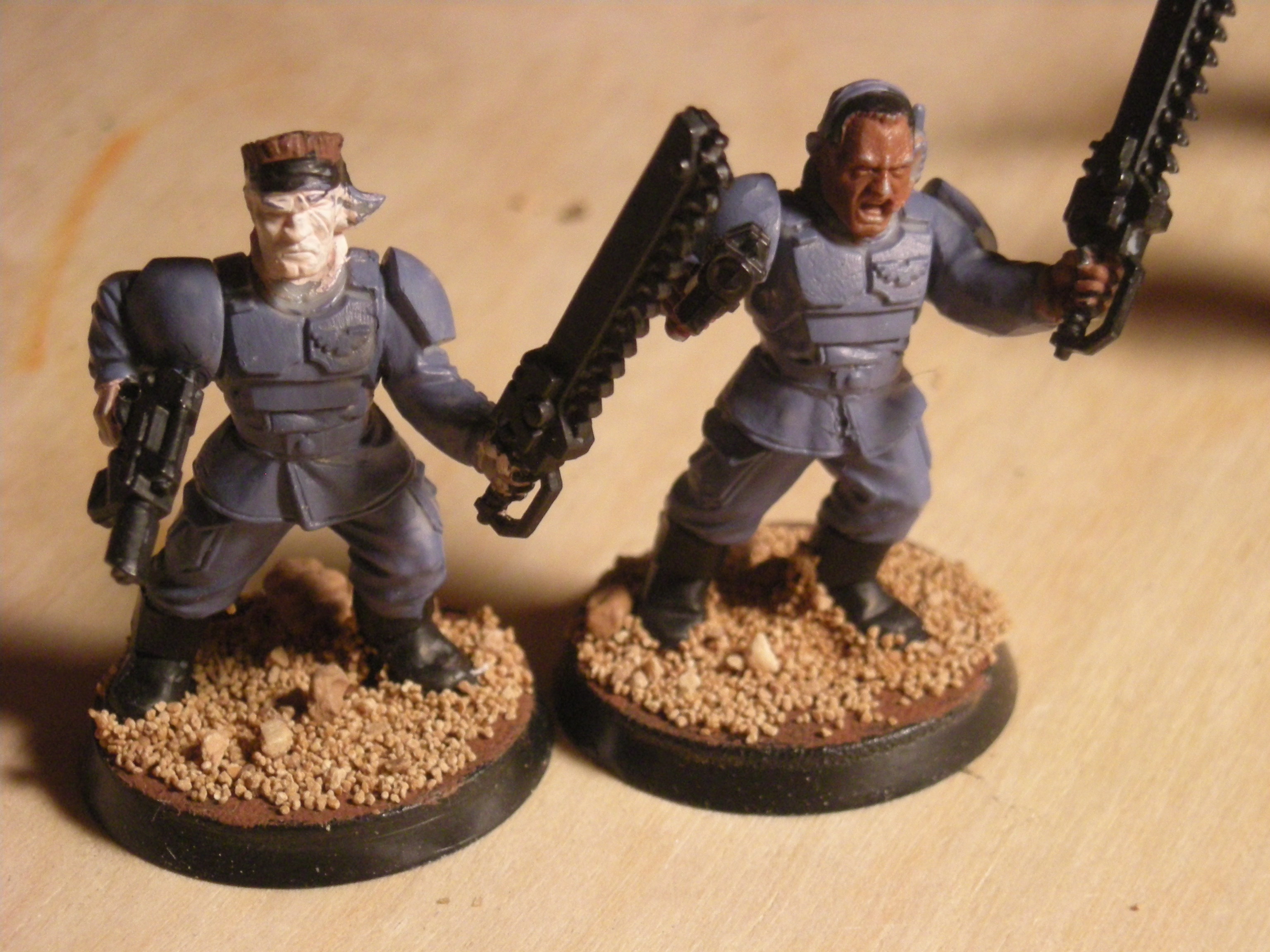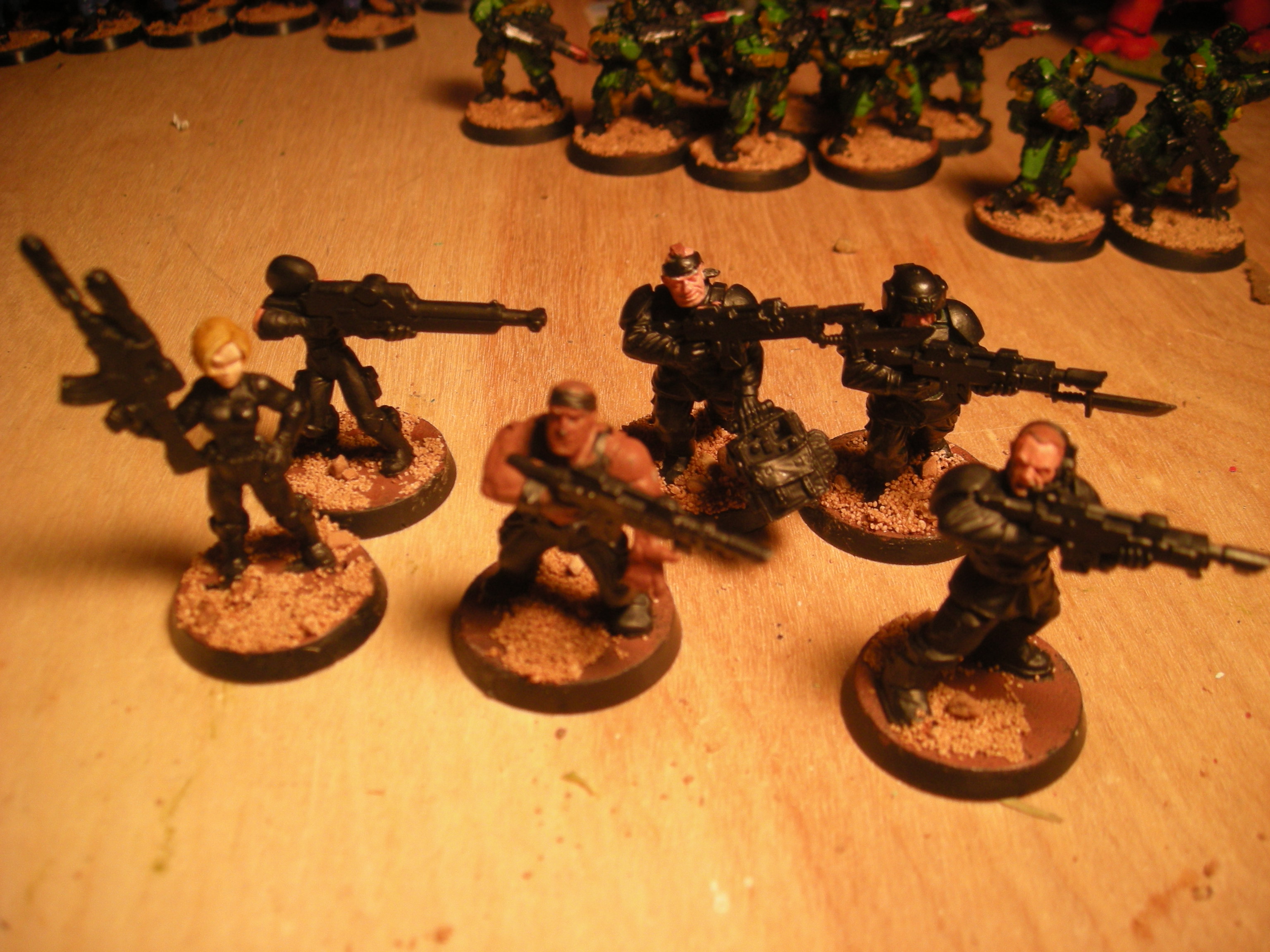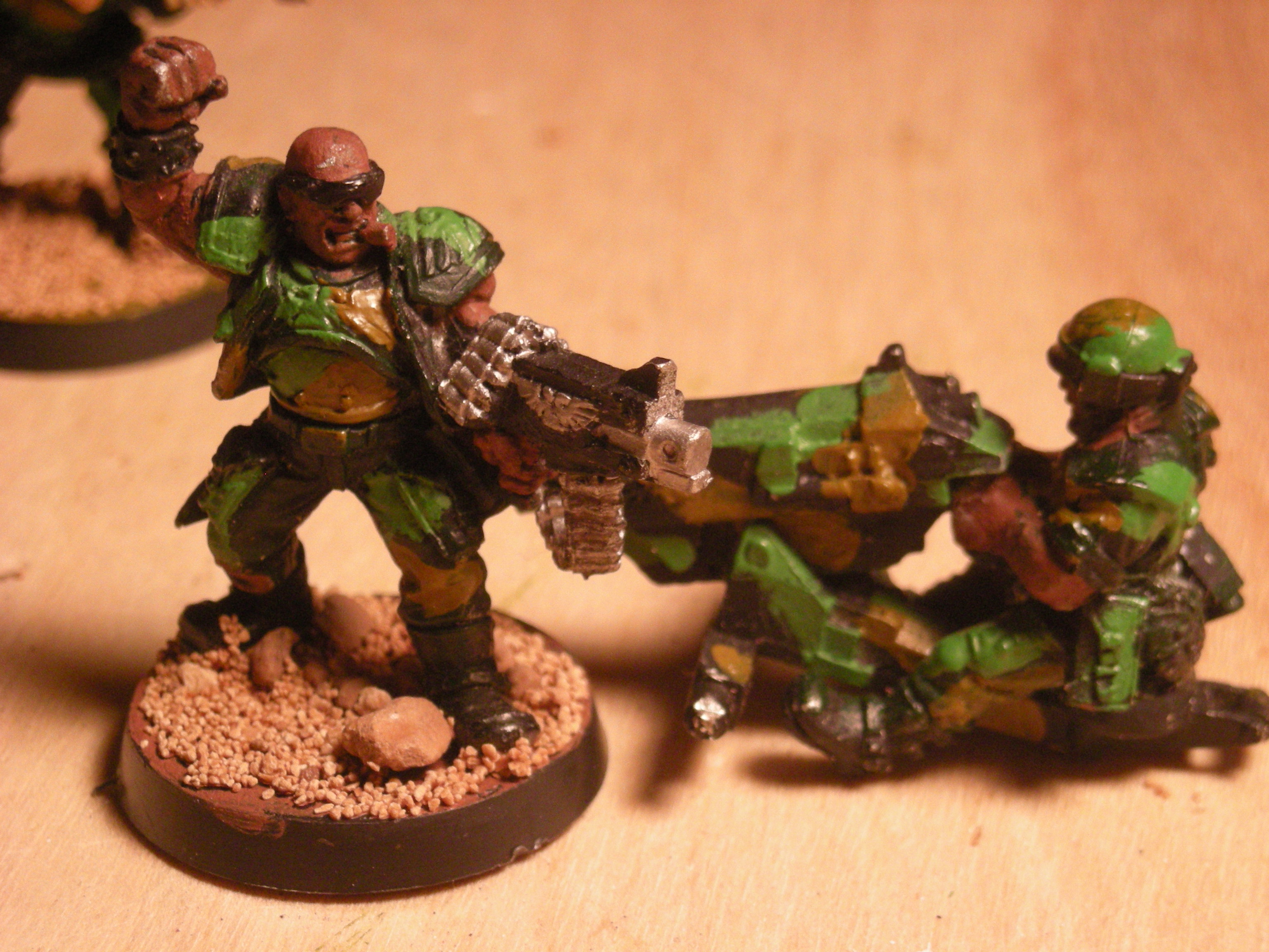 The Snipers are unique FEMALE models I found in my FLGS back in 2001 (?) when I put this team together. I have no idea what game it went to but they fit PERFECTLY with my IG army.