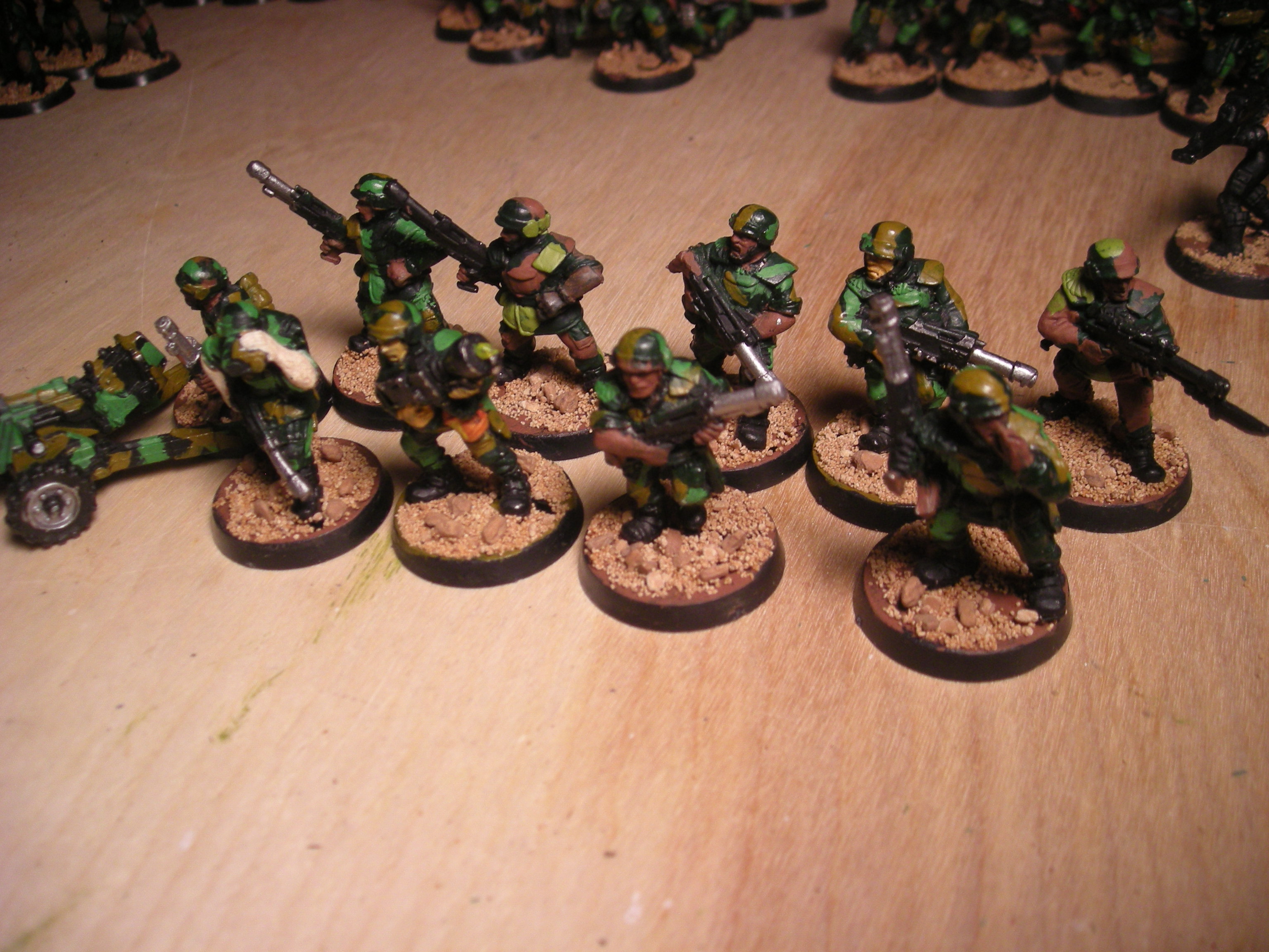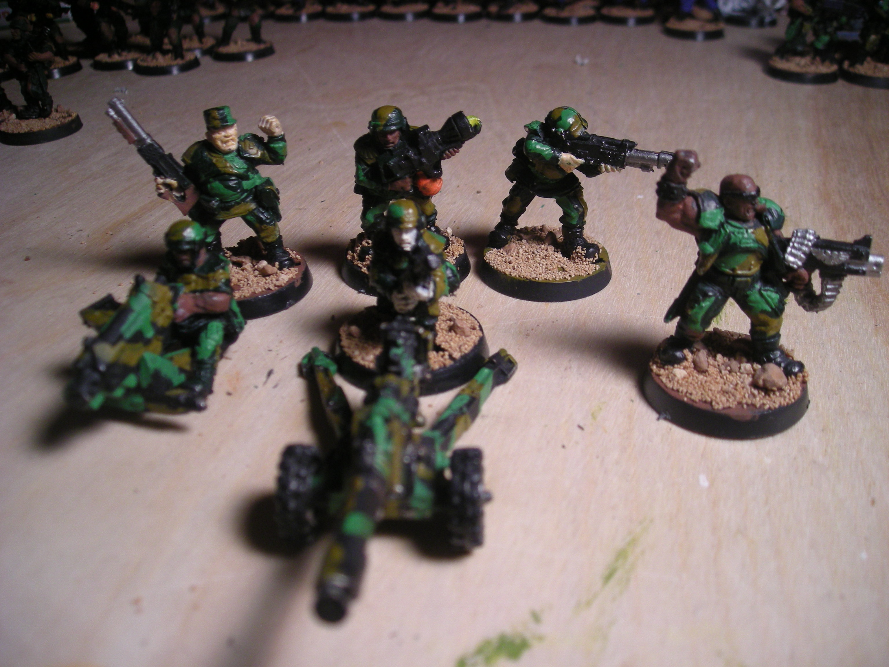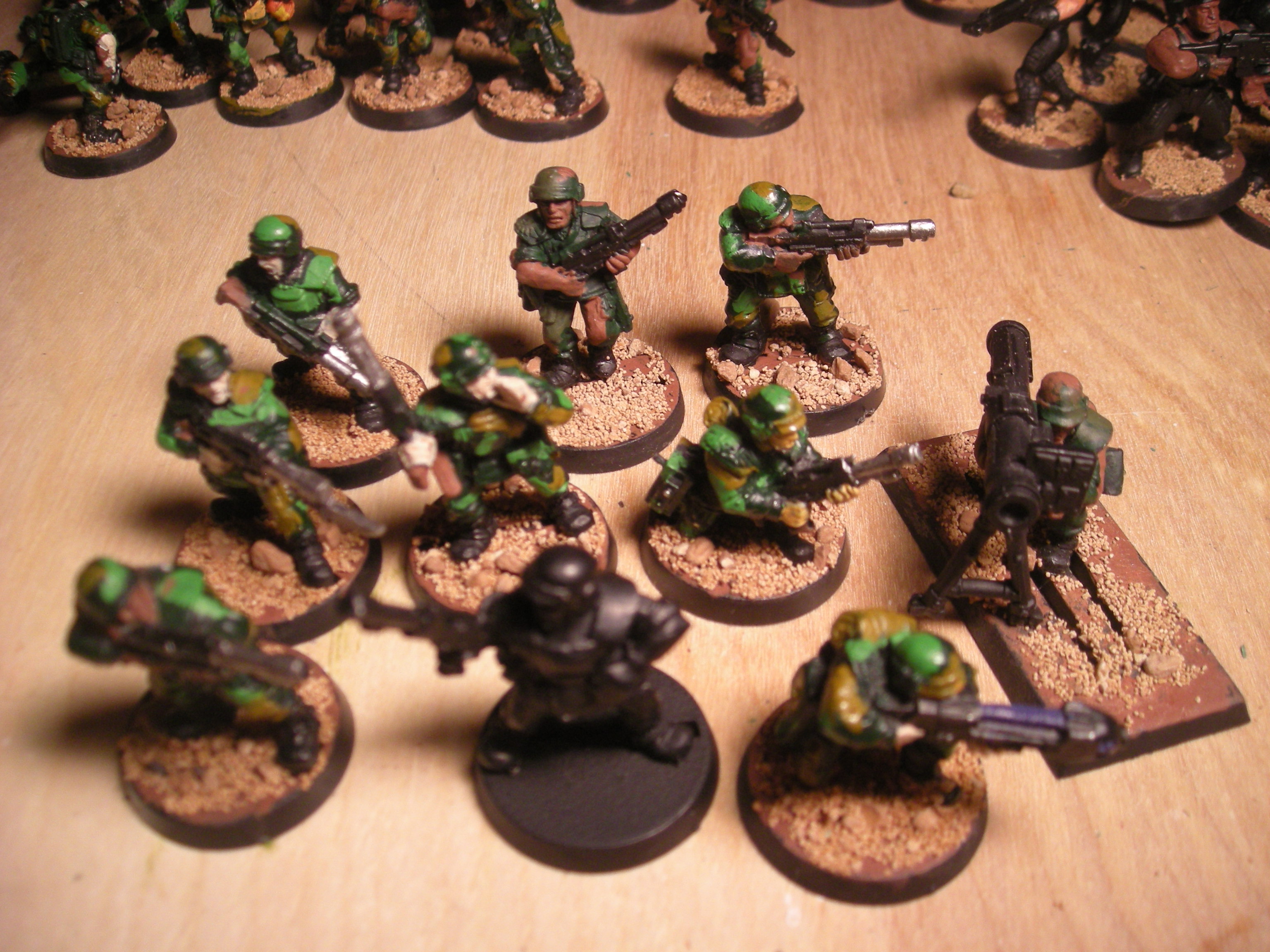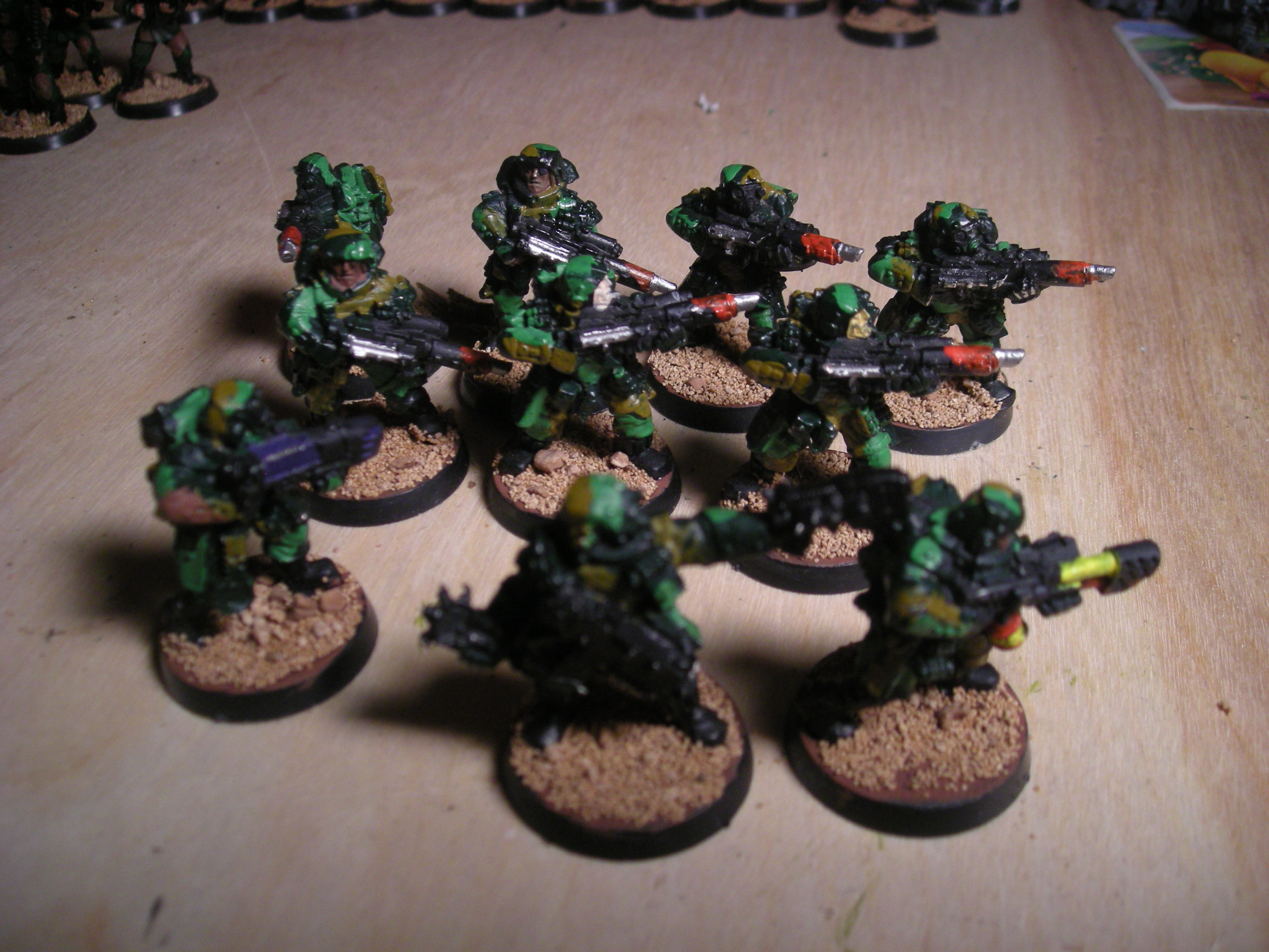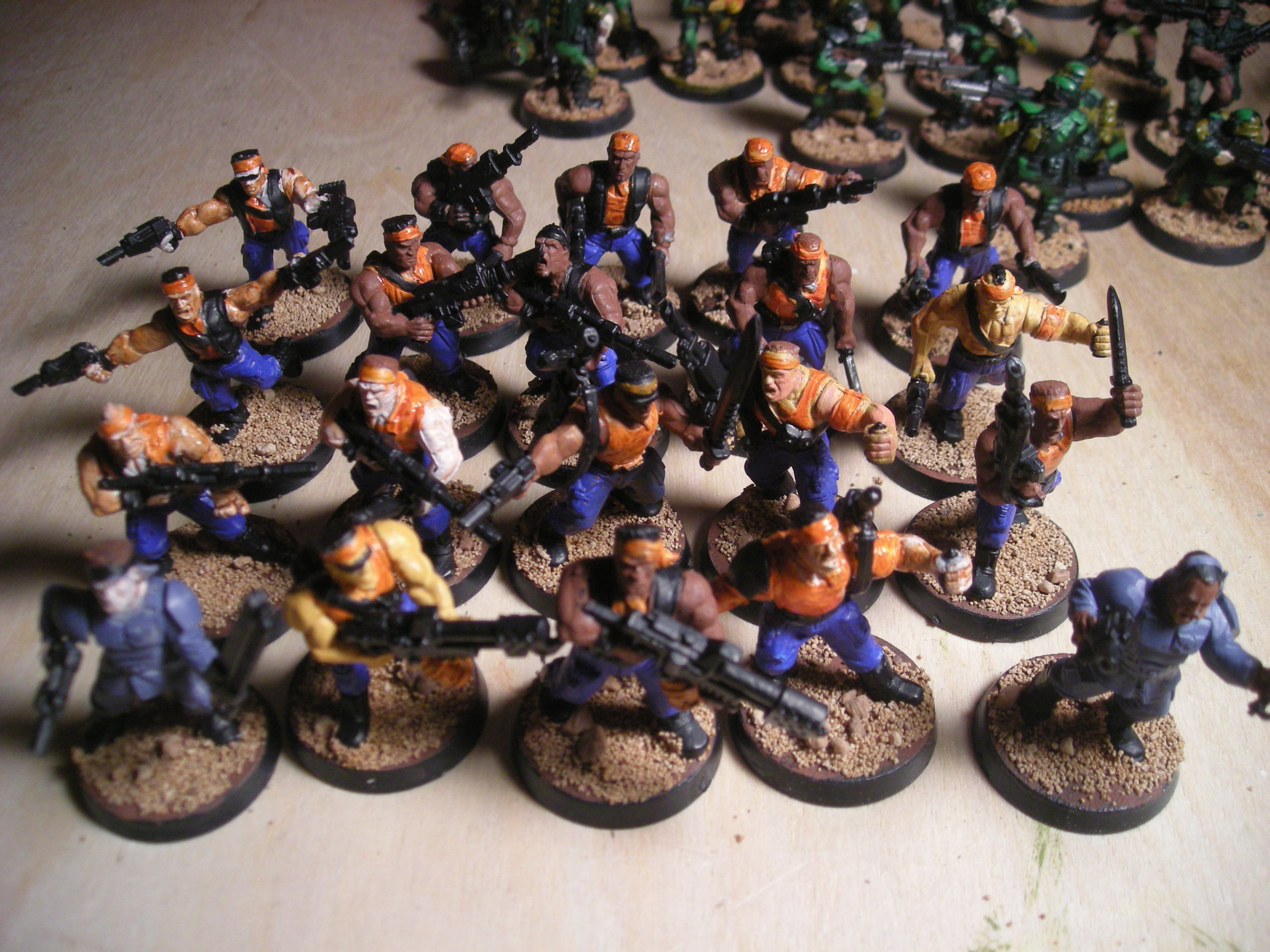 These were a bright idea I had back in 2003. I bought a bunch of Catachan plastics and turned them into my penal colony troops painted in blue jeans and blaze orange. There are two cadian "wardens" with them. The 20 plastic models include 2 flamers.
