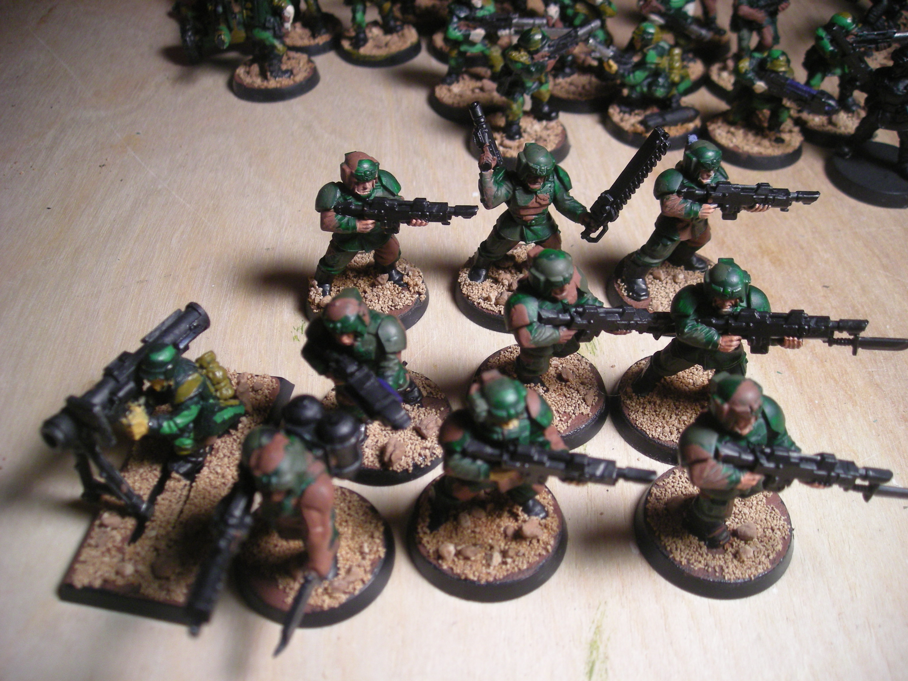 Next is a platoon of 36 models, 27 of which are metal! I actually had 2 platoons of metal cadians and had finished the second right when plastics came out. I traded the second away long ago to a guy who wanted to use them as conscripts since the metal cadians are about half a head shorter than the plastics (Pictured below). A note on the painting; all of the troops are mutli-ethnicly painted. There are white guys, black guys and all shades in between.
