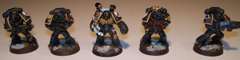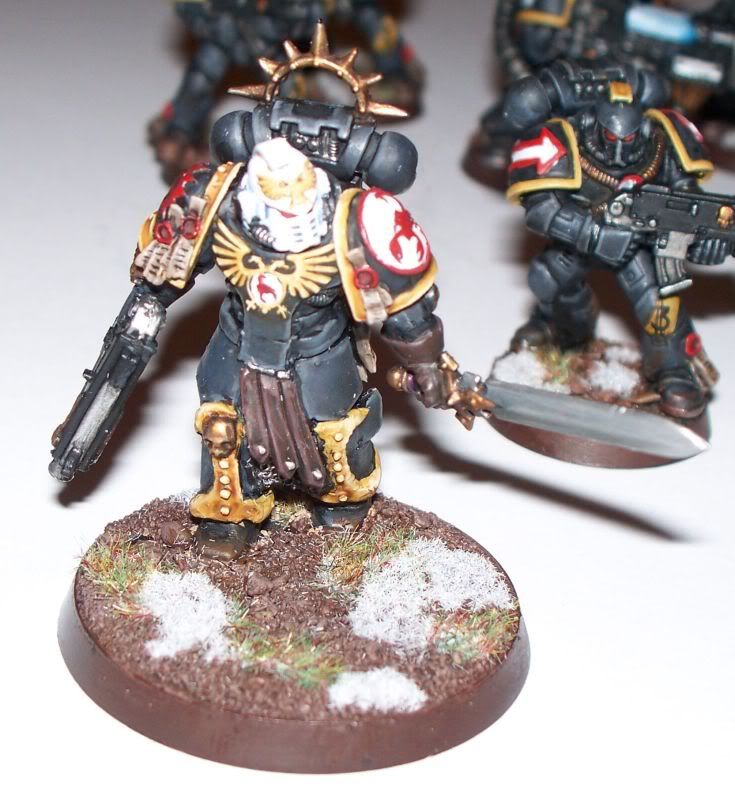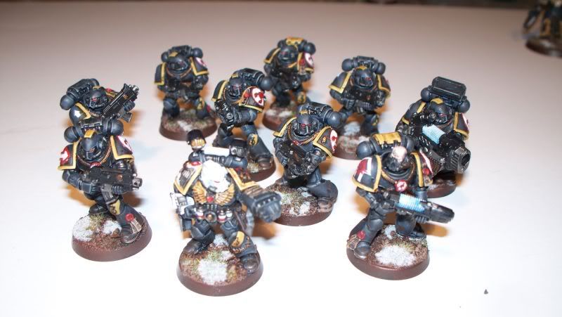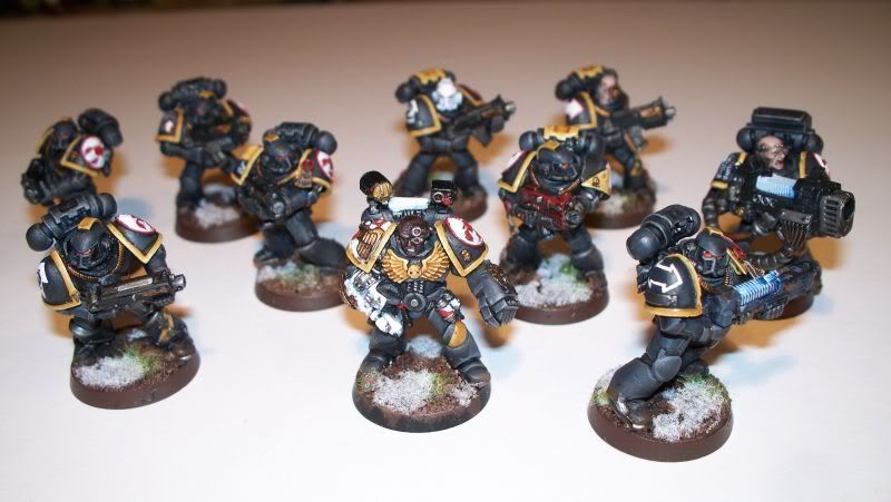 The entire idea behind the army is to have a no-nonsense, practical but individual army. There's no banners, no cloaks or any jazz like that. Each Astartes' armour is personalised in some way, be it scriptures, placement of squad numbering and company logos (similar to the Dark Angels in design, but they stll go by the Codex). Each marine has his own variation of the Tactical Markings, some like the Dark Angels, some are just outlines, others are normal or just in a different place than the rest!