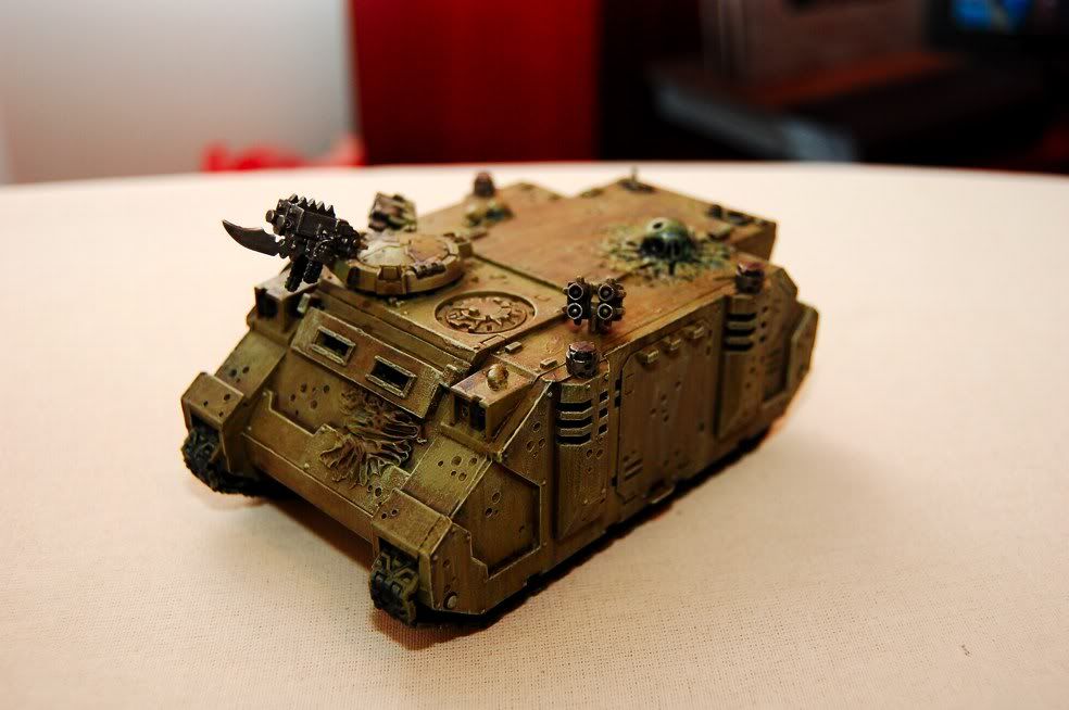 working on the next Rhino now. this is still a WIP. I still need to paint the "Nurgley" green stuff parts, the tracks, and the smoke launchers. Also need to highlight the twin-linked bolters. But hey, it's an update at least.