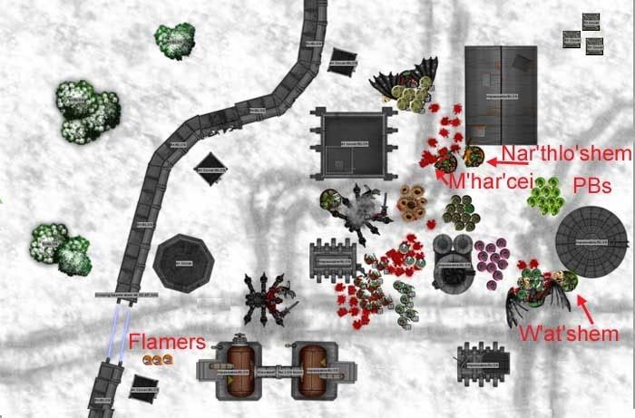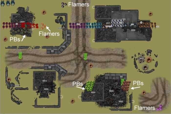 PBs went on the other icon near the dome and the Flamers scattered badly, my opponent got to place them, and he evilly put them right in the middle of the electric fence. Urg.