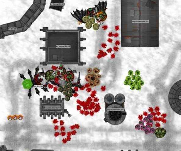 After all the running, the Plaguebearers charged the Fire Warriors. As is normally the case with Tau, the Fire Warriors 13 attacks amounted to zero wounds on the Plaguebearers, who promptly turned around and killed two of them. The Fire Warriors turned to run, but were cut down in their boots by the Plaguebearers. Stepping over the bodies, the
