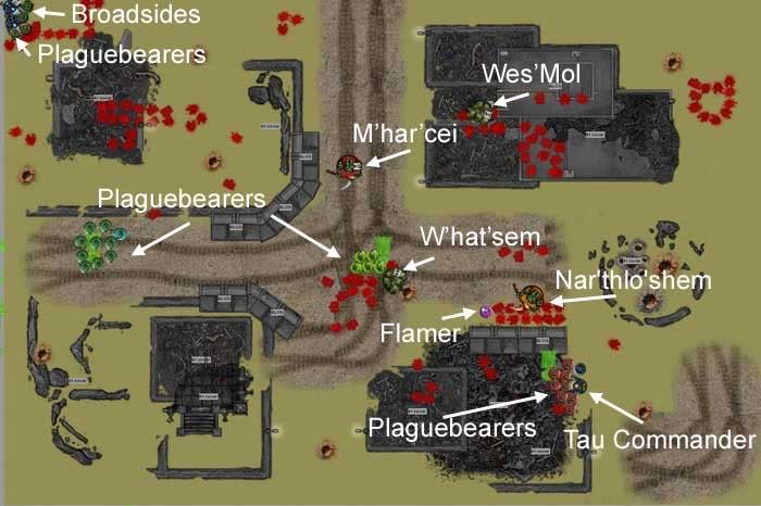 His Commander put a wound on W'hat'sem. The markerlighted Fire Warriors completely failed against the middle Plaguebearers. The rest of the Fire Warriors put two wounds on M'har'cei. The Broadsides on the roof put a wound on Wes'Mol.