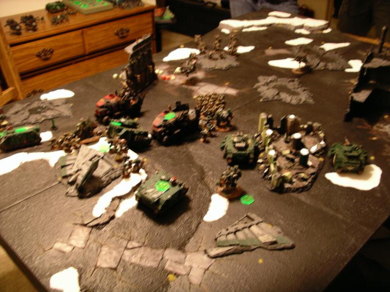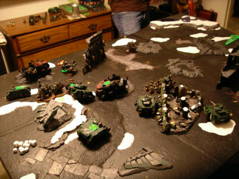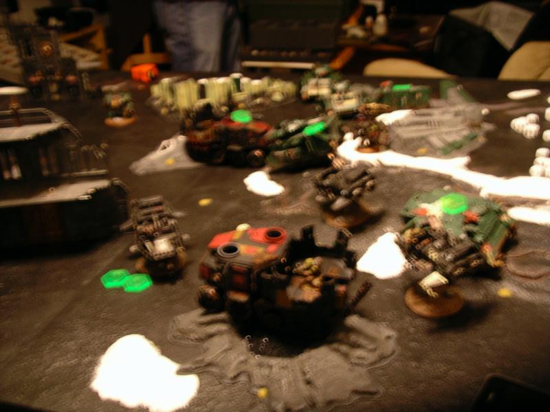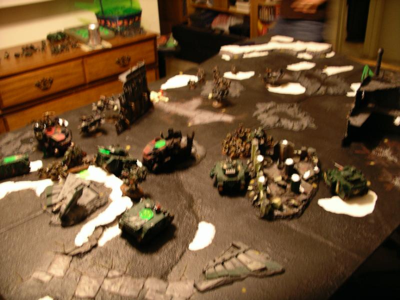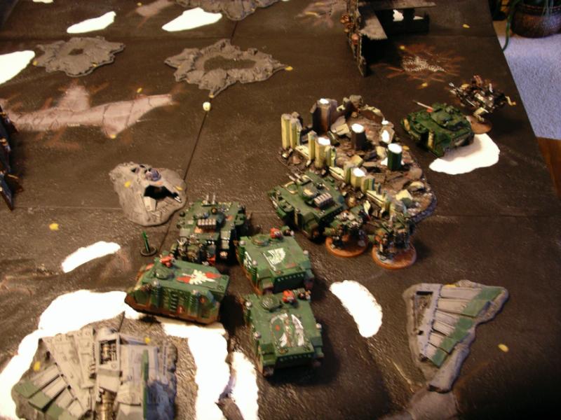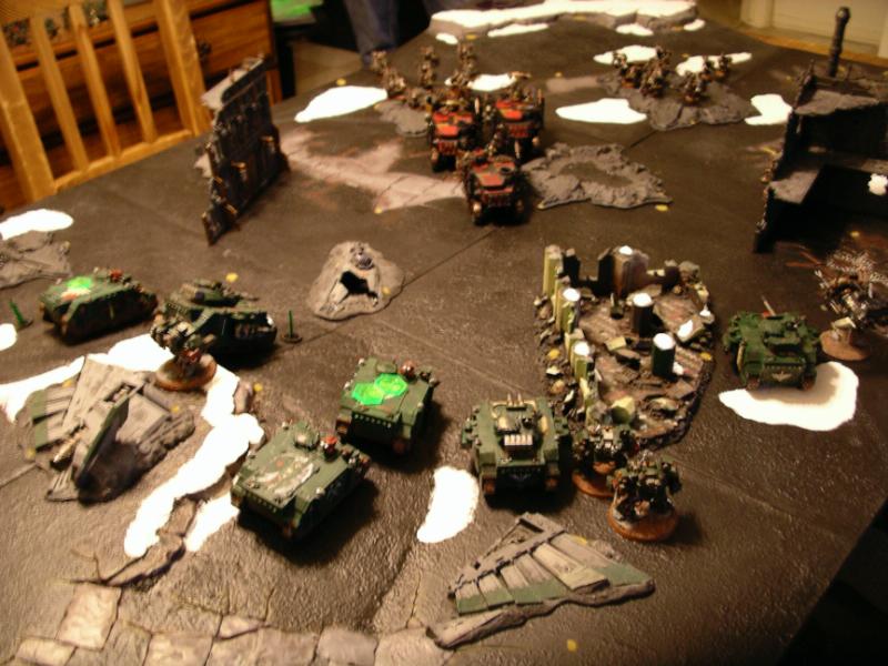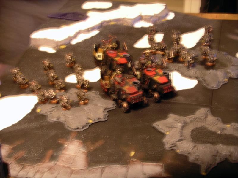 He motors his wagons ahead 13" right down the center line of the table. One loota unit opens up on a rhino in cover and immobilizes and shakes it. the other loota unit went after a dreadnought in cover and shook it.