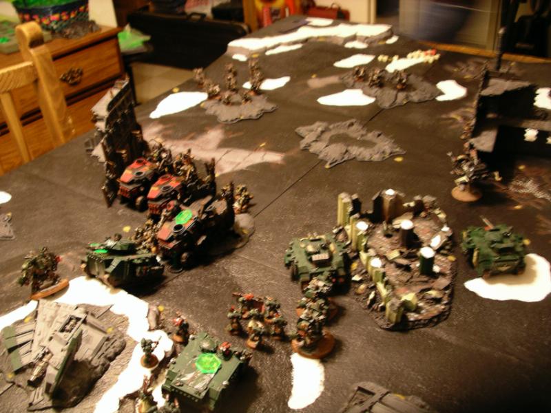 tac squad as close to the approaching orks as possible, to spoil their auto '6' waaagh that they had coming, and to keep that combat close to my support that was running over from my right flank. Ghaz and company fired at my fresh
