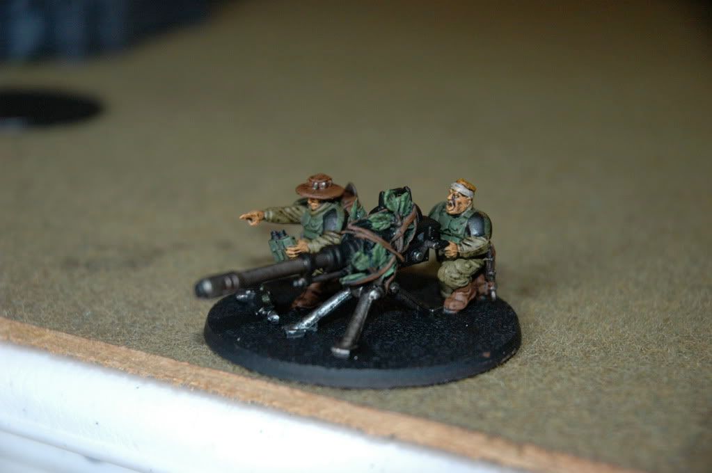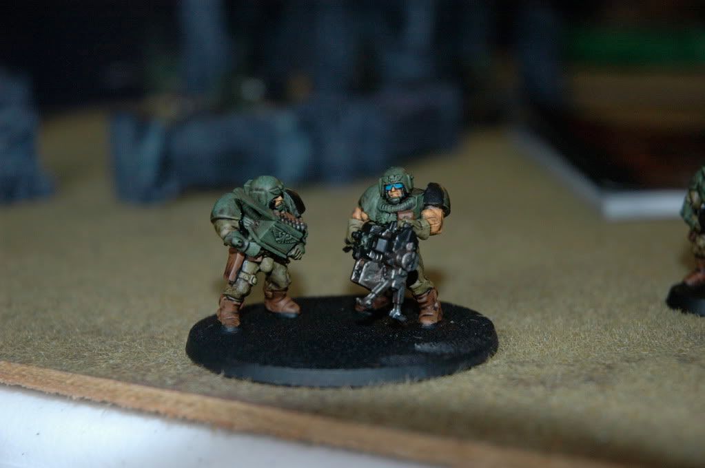 Oh ya, the second pic is just a mid game pic of a squad. Someone (one this site I think) described how to get more models from the IG heavy weapon squad box and that is what I followed for the HB squad in the ruins.