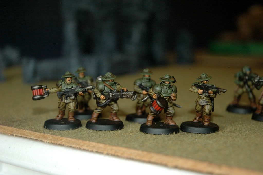 There is alot to read here so i looked at the pics and skimmed to the bottom, I think all the guys look great, now for some ideas how bout Rough Riders on crocs, or your commander having a pet croc, add a snake on sly marbo to represent poison? And Chimeras with the treads plasticarded over and a huge fan on the back would be sick(airboat)