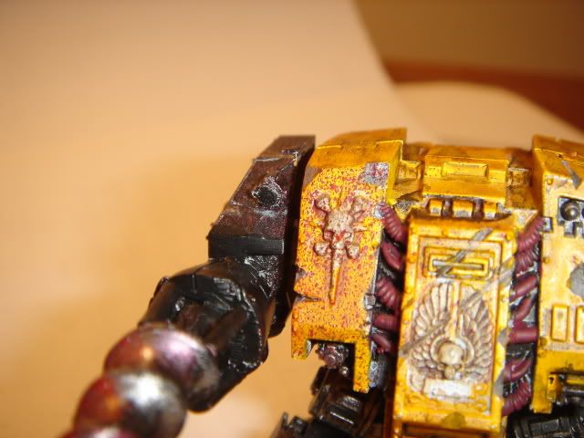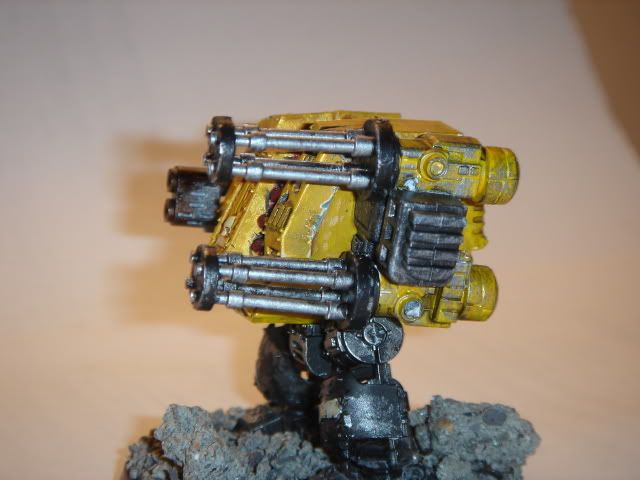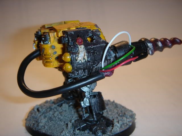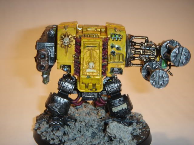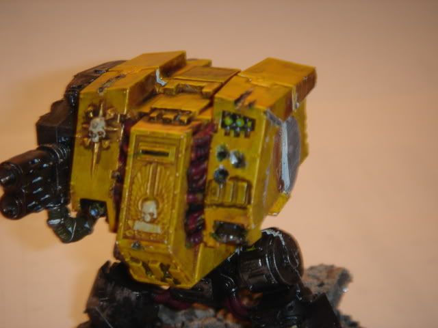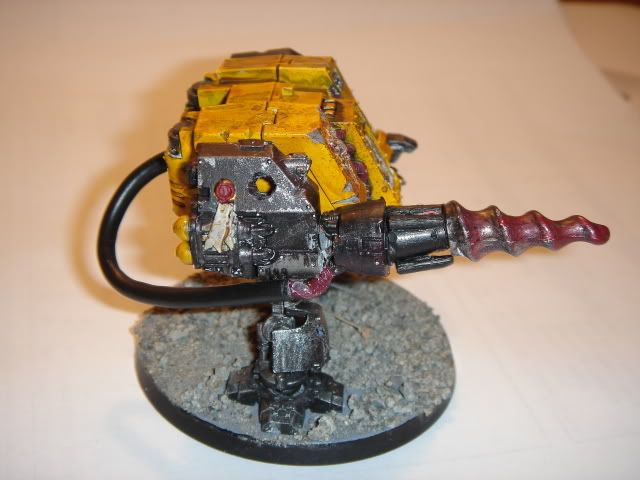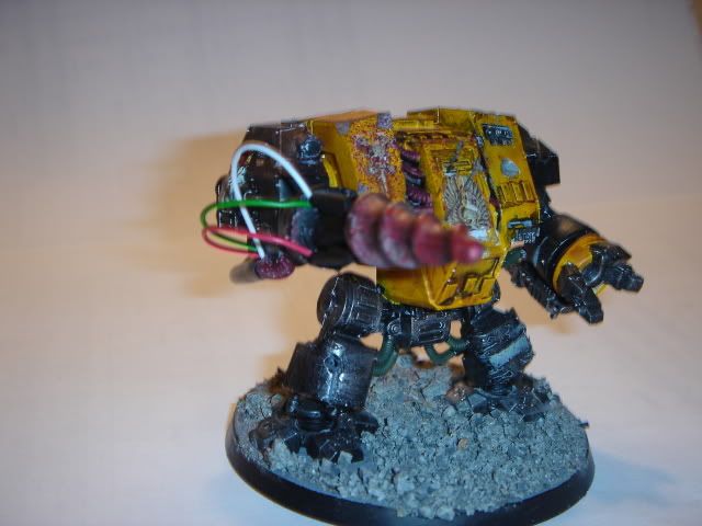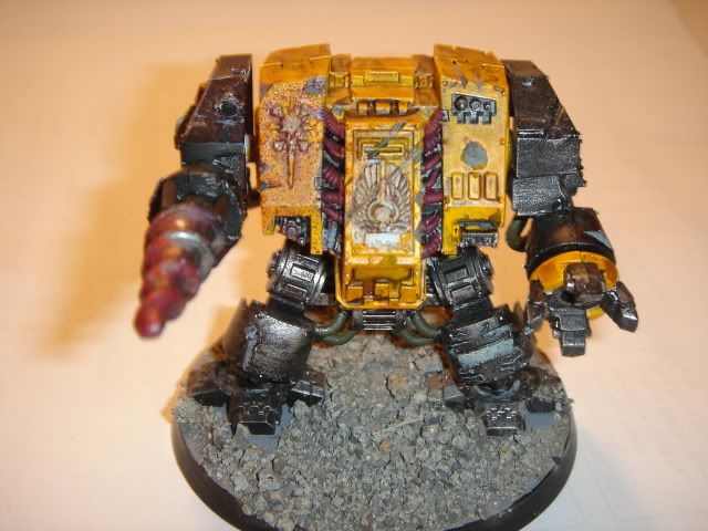 on MLY - The dry-brushing is there... alot of it. The camera flash really seems to have abscoured the golden yellow/sunburst yellow combination, but its there. Funny you mention it was done with water colors... because I used a Baal Red wash over the Scab red and Red Gore base coats... The drill's power cable was a last minute add... water cooled? No.. I picture more of it as something that taps power straight off of the Dread's powerplant for added power. So a Seismic Hammer or power fist isn't appropriate to whack a guardsman or two with, because they're anti tank weapons?