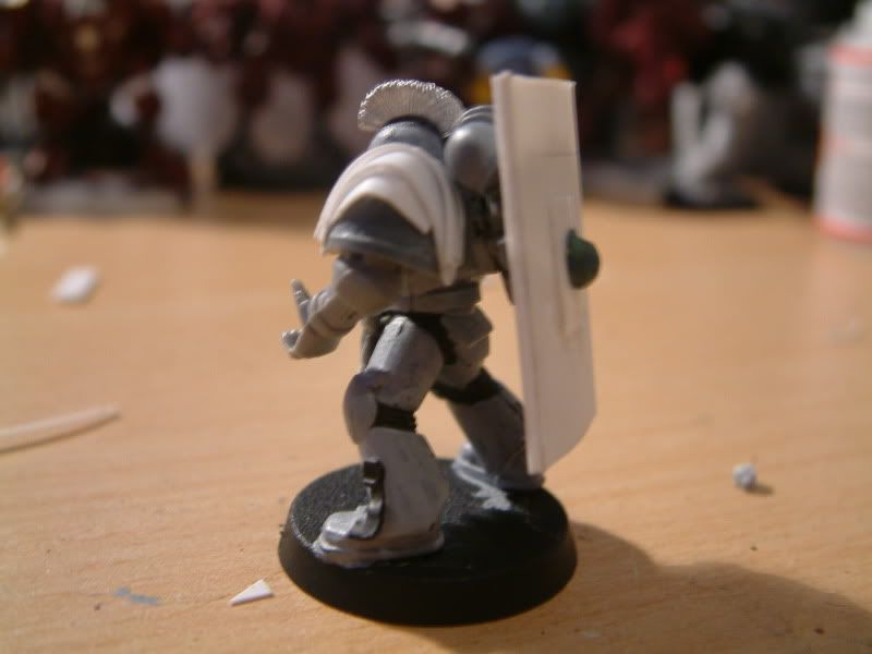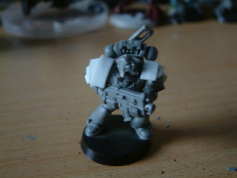 The shield itself looks good, but I don't like the look of it tied to the backpack - it seems far too cumbersome for a marine to bother to carry. However, maybe you could hang them on the hulls of their vehicles (plus you could count it as extra armour if you want ) It would also solve confusion that the only models that actually carry shields are the ones with storm shields.