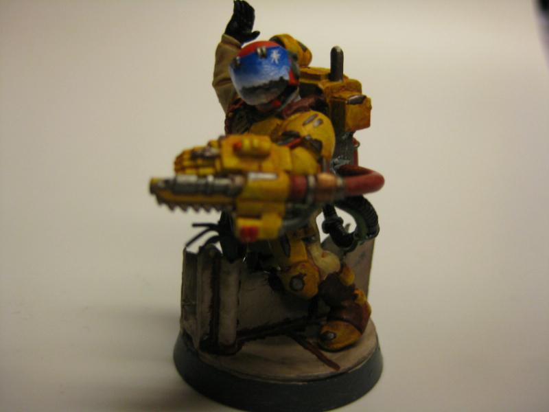 Okay, as for chipping, a good plan is to use a dark non metallic colour first, and then paint inside of this with your chosen metallic colour. I usually use Scorched brown, since I find black to be too dark. Then chainmail for the scratch or chipping itself, and then badab black over this, to give definition.