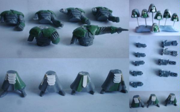 I've also got the basics done for a lot of the parts legs, bodies (although the left arms are going to be cut off once the GS is dry and smoothed, to allow the moulding to be done easier, and to give a variety of poses), weapons (the right arms are staying attached, allowing each of the bodies to have a different weapon and differnet pose) Heads (decided on using the woodelf hooded heads for convenience sake, and to go for the "hellboy" gasmask look with various sizes and numbers of augmetics)