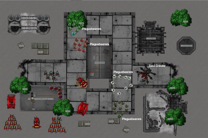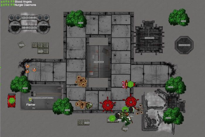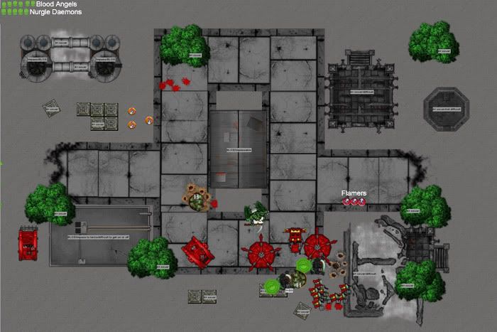 Lord Wes'Mol and Prince M'har'cei were the only Daemons that seemed eager to get into the fight, and they appeared off of the green Plaguebearers' icon in good position to attack the Blood Angel troops - particularly Mephiston. All of the Plaguebearers surged forward, eager to engage soft targets, while the red Plaguebearers gathered steam to join in the fight against the Death Company.