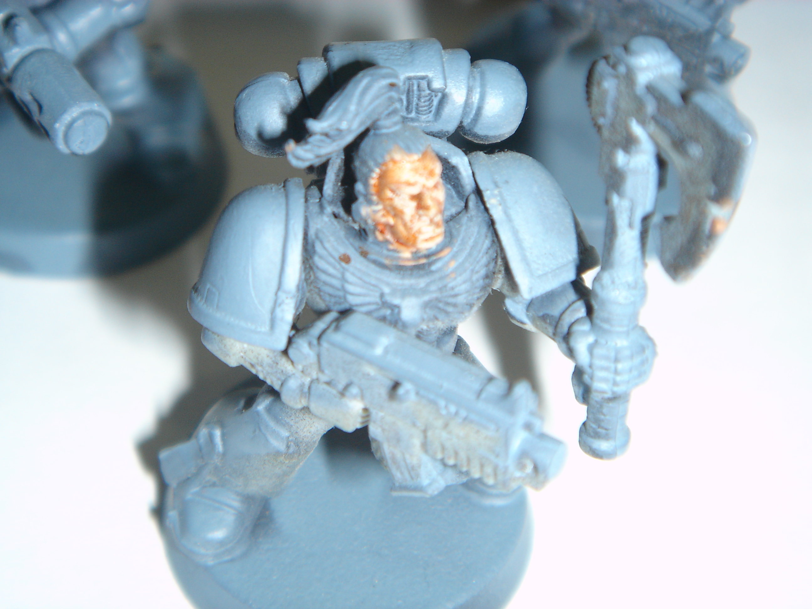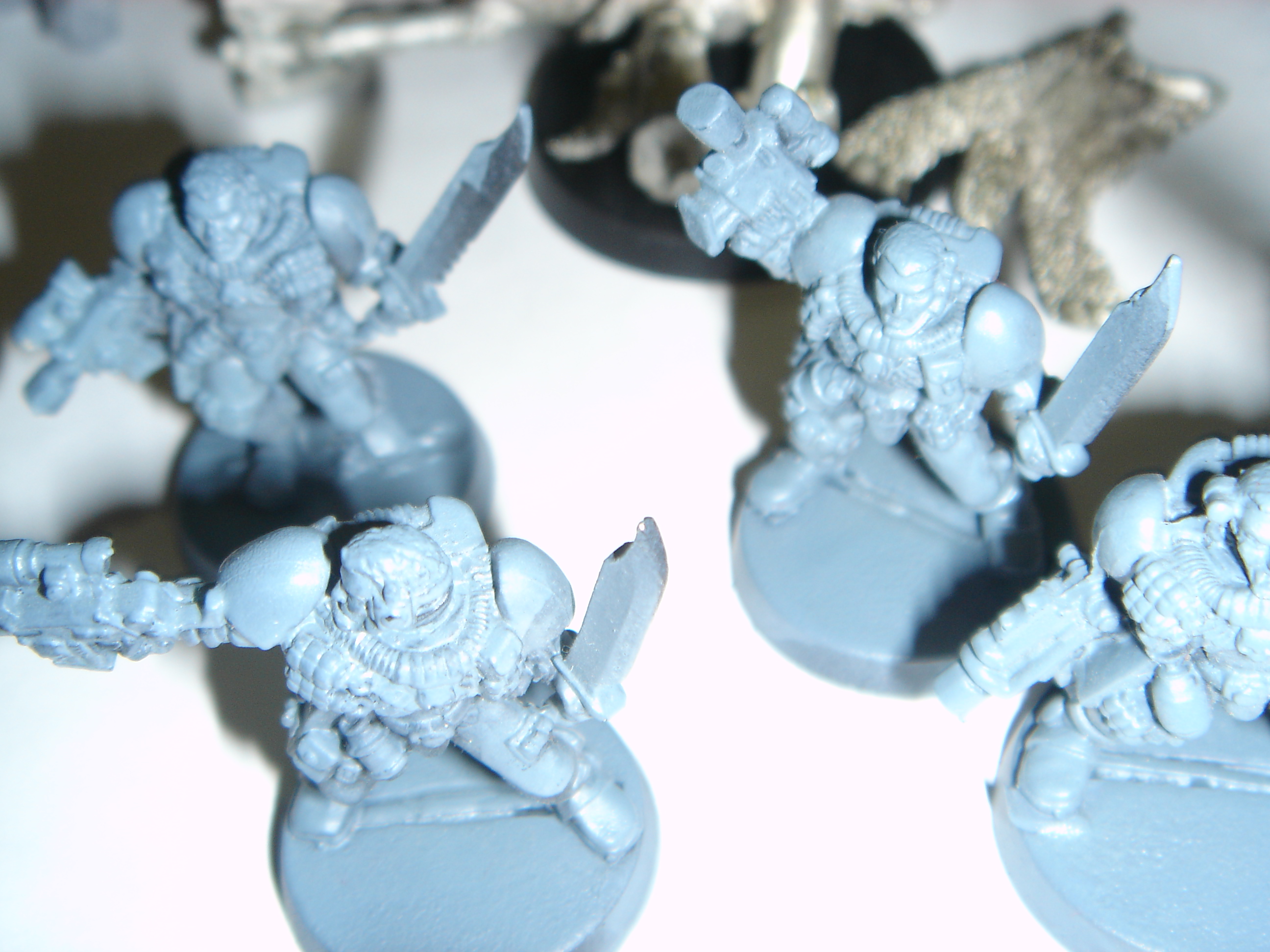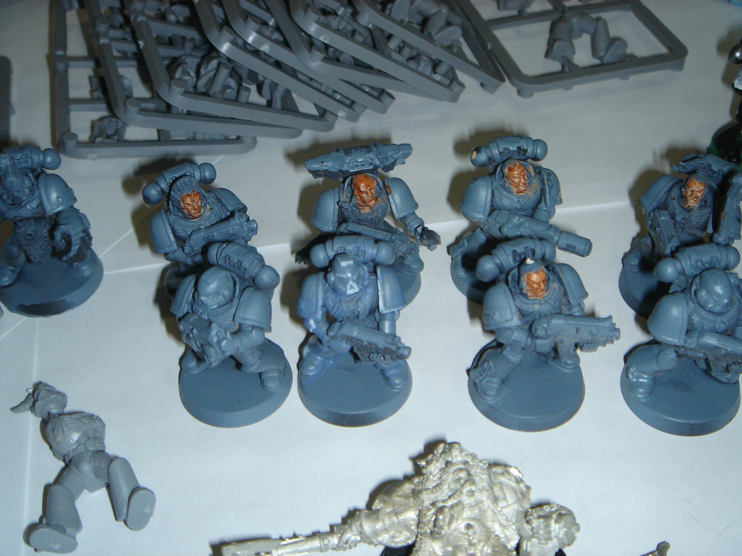 The sprayed marines, were sprayed 1st with chaos black then 2nd with shadow grey, ready for painting into nice space wolves. Some have their flesh painted with simple, flesh, inked and drybrushed. So here they all are.