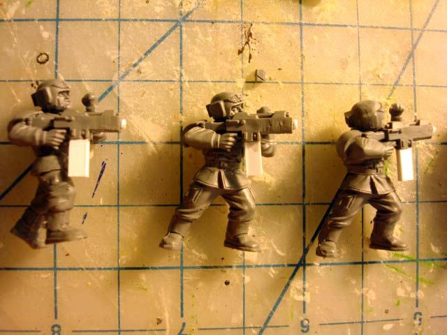 For your Guardsmen as they are, I'd suggest shortening the extended clips a little bit, they do look a bit silly being that long, but it's a nice idea. If you want to try any Sickle Mags, heating up the plasticard with a lighter and then slighly bending it around a small piece of metal tubing works farly well. Just don't heat it too much or it'll warp a bit when bending/cooling.