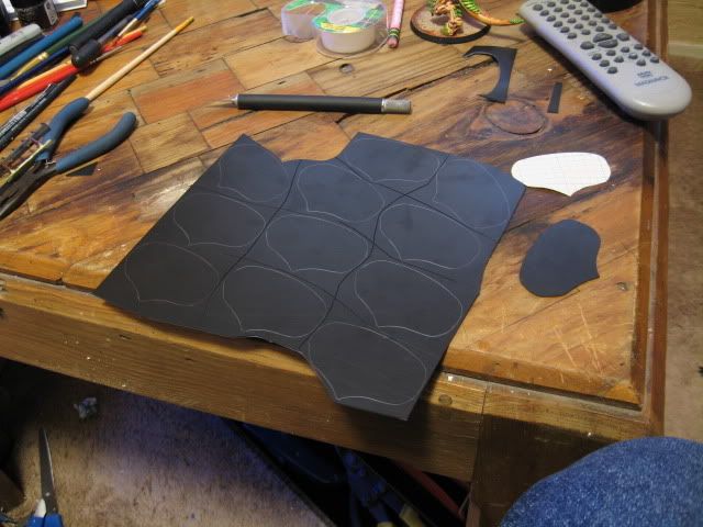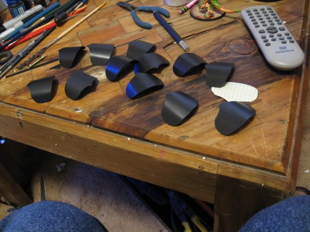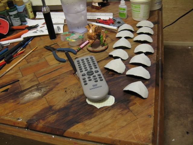 I then lined up the plates and glued them together in an arc. for filler, I used aluminum foil. I just balled it up into the rough shape I would need, and lightly glued it to the shells. I then traced out some bases onto plastic, cut them out, and again lightly glued the aluminum to the bases.