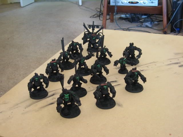 I got the final details on the Goffs done. I do believe I will be going back and touching up the two character models, but they're good enough for the table for now. All told about five hours to paint six good size models.