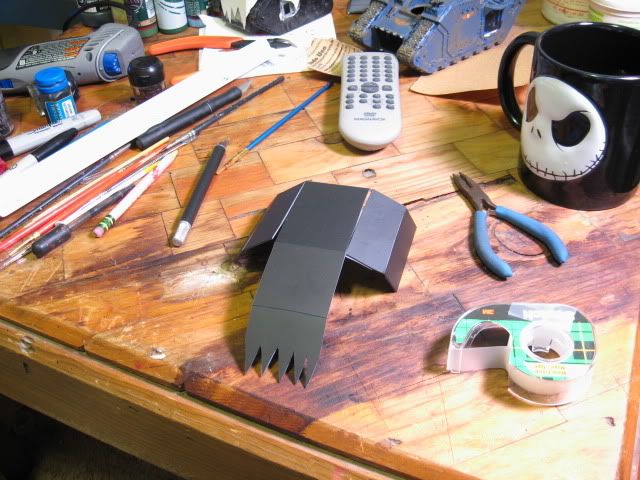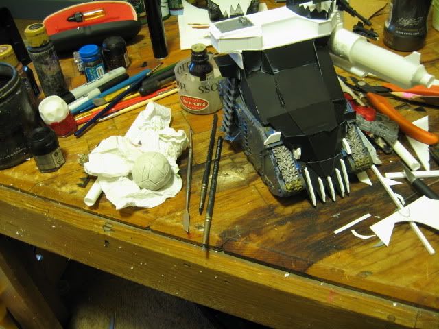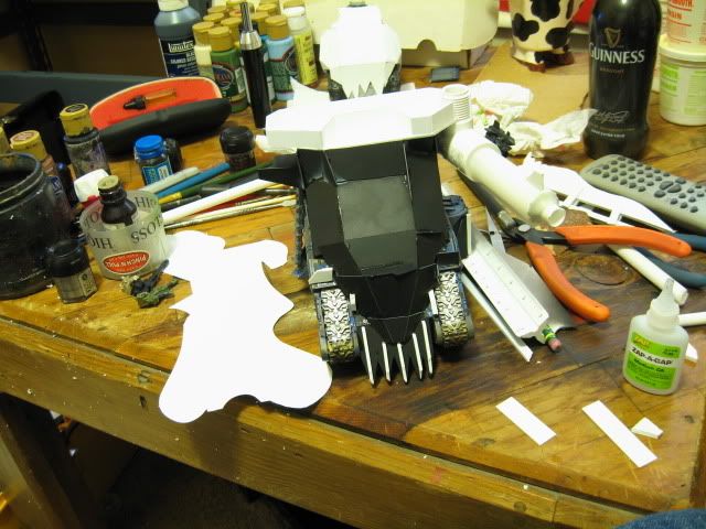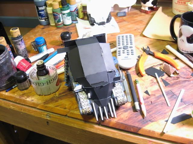 Once I had the hole carefully cut, I promptly forgot about it, and added a ton of detail to the front. I like the layered armor effect, I really want this solid looking. I also glued strips of plastic onto the teeth, to reinforce them and make it look cool. Strips of plastic are nice, you can buy them in all kinds of sizes.