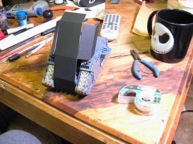 I decided to knock out the back first, so I added some diamond plate where a door is gonna be (its the white card, the detail got washed out,) and some new, better tail pipes. (damn Mars pattern engines sound like a kitten purring. who the hell wants to go to war in a quiet tank?)