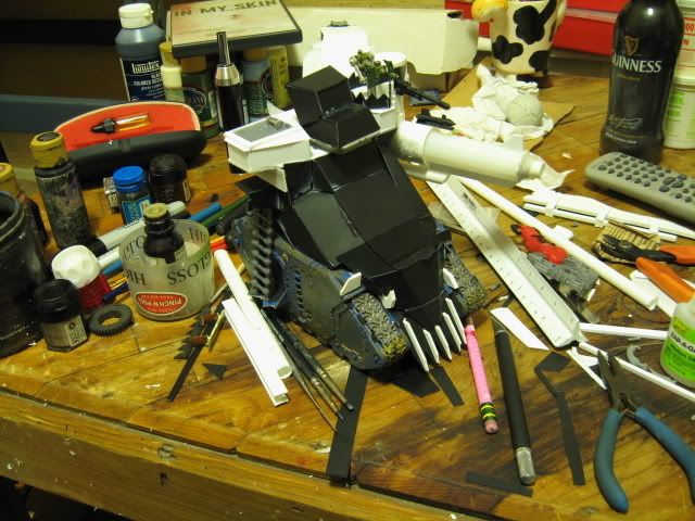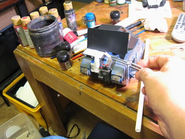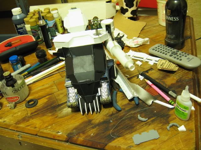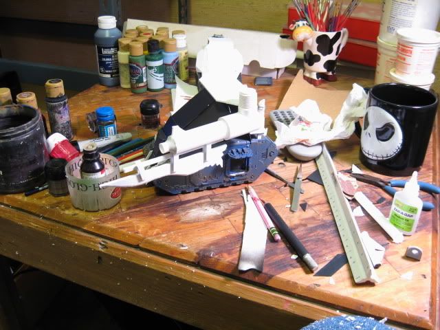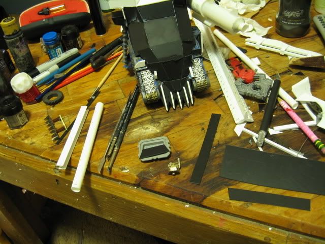 next up, I started assembling the Killkannon from PVC joints and plasitc tubing. I also added the shoulder base plate. (the pictures a little whited out, the kannon is next to the tank, looking suspiciously like a crack pipe. I have a swing light I use that goes over my worktable, I need to remember to turn it off for pictures.)
