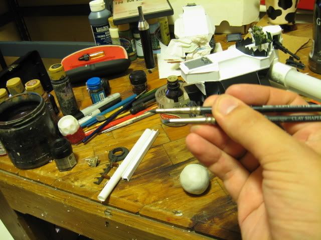 Lastly, I put a little clay around the bases of the guns to hold them in place, so they don't snap off while I put detail on them.