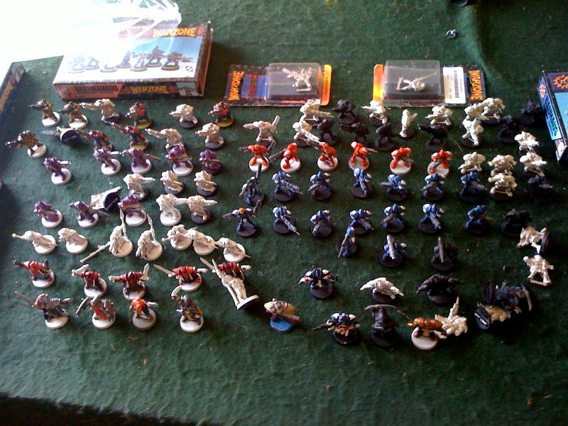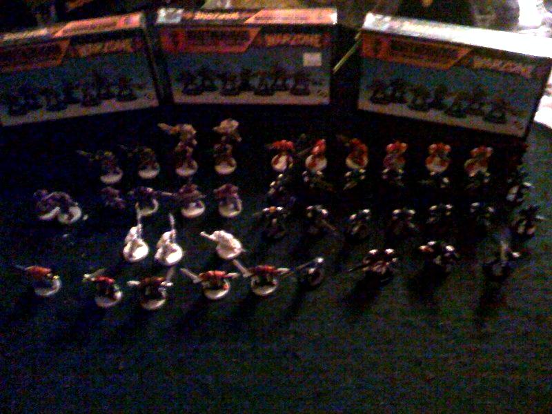 I have to apologize. I washed my iphone last week on thursday and couldn't get the other two pics up for you. Here they are: The brotherhood:  12 Pilgrims 9 Arch primates with standard weapon 2 Arch primates with flame throwers 3 sergeants 6 valkryies 1 blessed vestal 4 sacred warriors 1 sacred warrior leader 1 old valkryie 1 Pilgrim 1 visionary 2 crusaders (4 armed guys) 1 Inquisitor majoris (flame thrower) 1 Inquisitor minors (rifle) 1 crenshaw 1 clerc/priest (don't remember what they are called 2 assassins w/ pistols 4 mortificators (1 old) 1 brotherhood trooper w/ sniper rifle 2 brotherhood troopers w/ missile launchers Out of box troopers 4 sergeants 5 light machine guns 25 rifles 5 throwing grenades 5 grenade launchers inside of boxes 3 sergeants 3 light machine guns 12 troopers Dark Legion Models 5 Last Ritesman 10 acolyte/initates 4 guys with big axes? 1 techno magus I think 1 Dark Huntsman 1 razide 3 of the smaller souls guys 4 different big acolytes 1 small guy with big gun (no clue what he is) 1 other guy I can't make out 30 undead legionaires I count about 179 figs up there. I'll throw in the rangers, whatever is in the 2 blisters ( i think some bauhaus characters), and all the books for $175 plus whatever the actual shipping costs are. How does that sound to you?