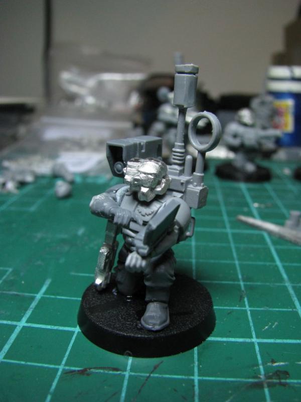 So I got tired of gluing tank tread together and decided to wander off to other things, like converting a MOO. I really don't like the GW model, looks a bit too "prissy". So I took a the tank commander body, legs, arms, and one of the heads, slapped on a slightly altered vox-caster backpack, and began work on an arm mounted targeting computer (I'm not gonna lie, stole the idea from someone on here!) Here's a couple of pics of him so far. Need to finish up the computer, then base and paint him.