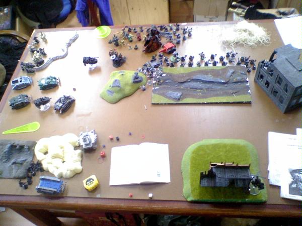 We alternated picking terrain till we'd filled 1/4 of the table area used (it's a little over 8' by 4', but we used around 6' by 4'). Then we alternated placing terrain elements, rolled for mission etc., and got a 3-objective Seize Ground / Spearhead mission with him deploying & going 1st. The 3 objectives were represented by pinheads placed on the table -- one about 12" in from the top and 12" from the left, near a long grey stone wall; 1 near the centre, just south of a large hill and river; and 1 on the right, just in front of a large ruin.