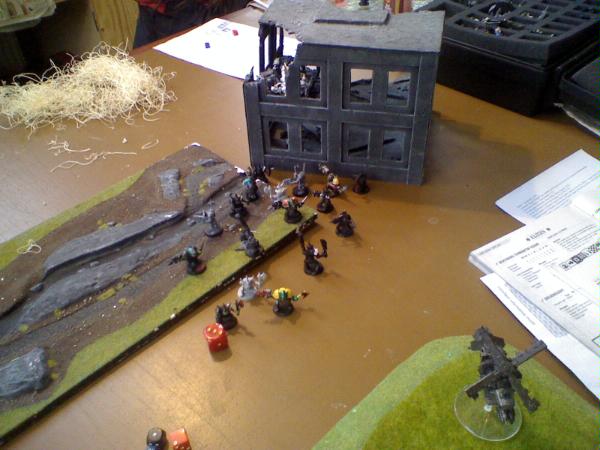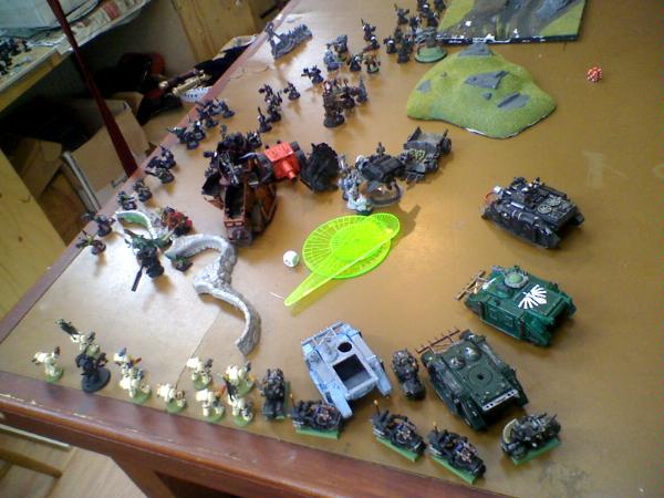 tac squad in to the big fight in the middle, hoping for some very lucky rolls to wipe out his guys there... no luck. So we ended up with a draw after all -- 1 objective each, and 1 fiercely contested objective in the middle.