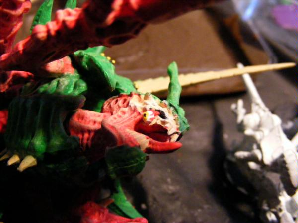 The guardsman is actually impaled on the scything talon on the carnys back. I'm not sure how it happened but if you ask the sergeant he will tell you it did. Also the lasgun basing is from the citadel basing kit. I think you should ask them that question. I think its funny as well.