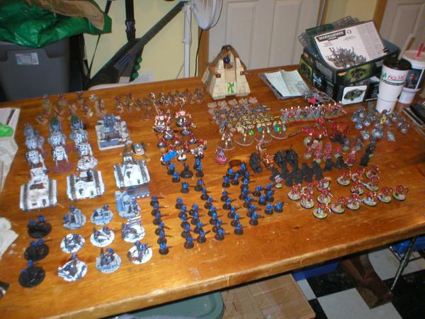 So, here, you can see about 95% of what I own (the rest are all 'on sprue'). The makings of Space Marine, Kroot, Necron, and Imperial Guard armies. I also have a pile of Orks that I'm going to sell off/trade.