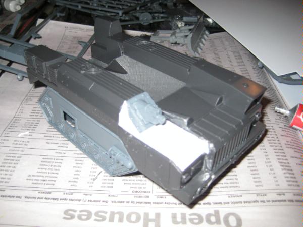I am combining, basically, a SCUD launcher with a Chimera. In this case, the original Soviet launcher vehicle. I was disappointed in that the model was a two-piece main hull, but I was able to razor saw my way into a happy result. Also, the hull is exactly the same width as the Chimera's hull. A fortunate coincidence that I exploited.