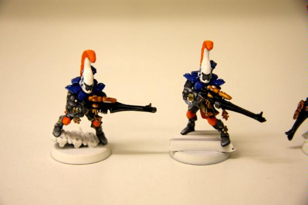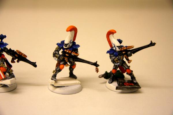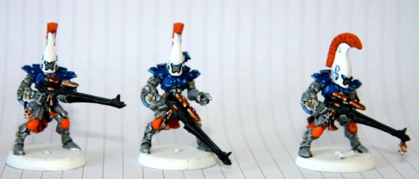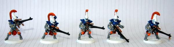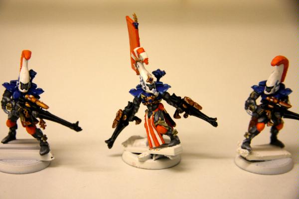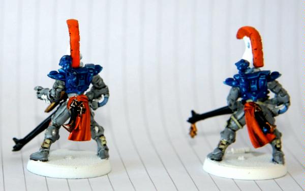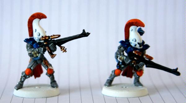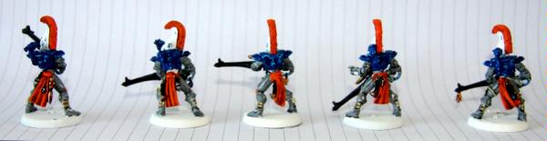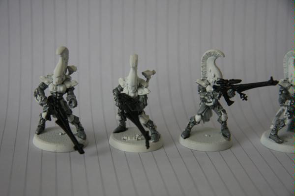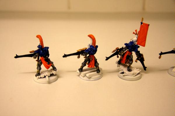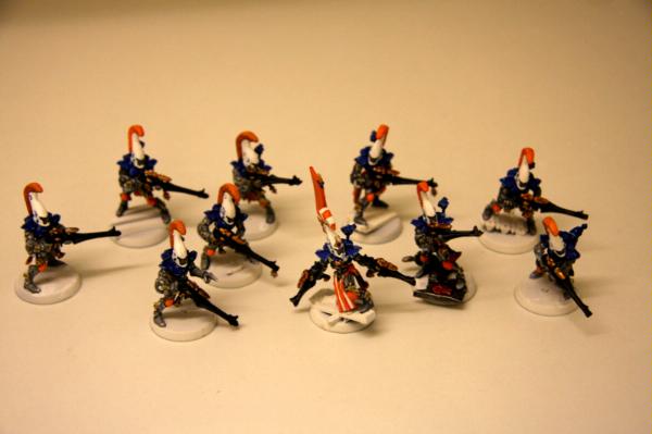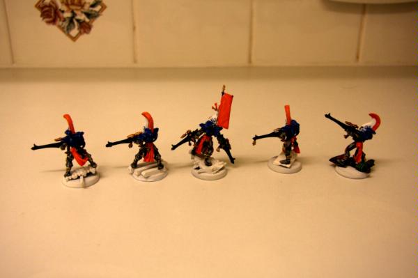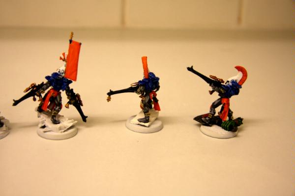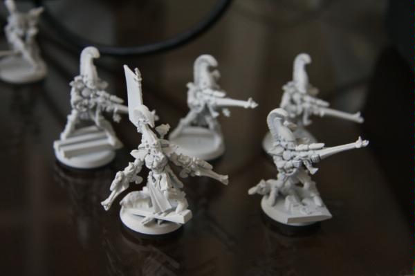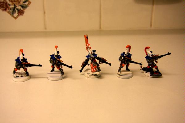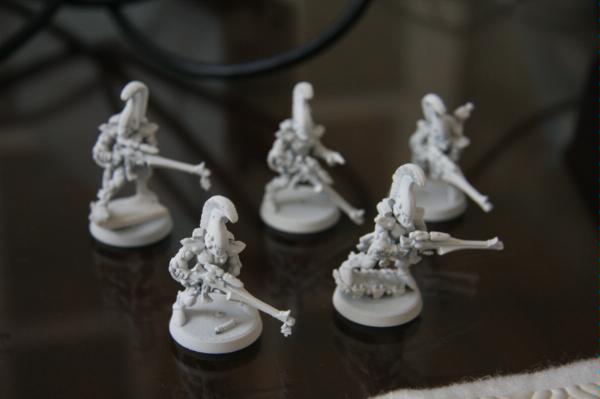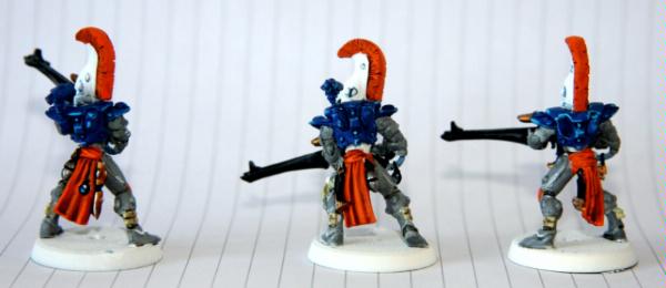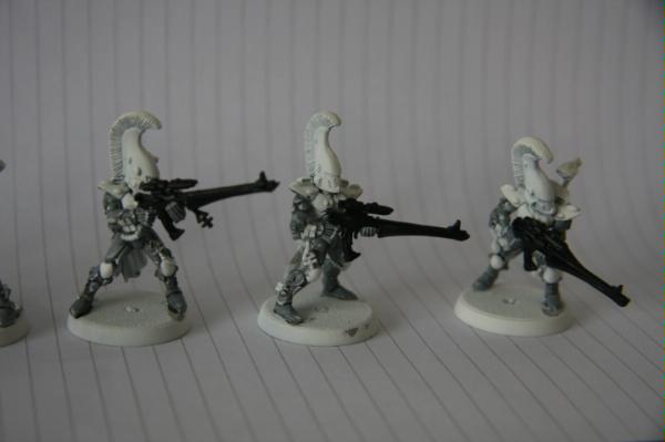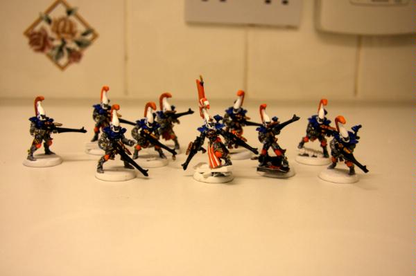 here, that was trying to get some commissions where I woudl paint some troop models for free. Unfortunately, to date, I have only had one taker (I'm still willing to do this if anyone else is interested), as I think my excessive "wall-o-text" put a lot of people off. Tek, however, was not put off, and sent me ten Dire Avengers to paint for him. He specified the colours, provided a photo of some minis for me to match them to and pre-assembled and sprayed them. The first set of photos below is how they arrived, and then the second set show my first painting session with them. I've only started on 5 of them at the moment and have only done some of the work on the grey areas and base-coated the weapons. No, they're not particularly impressive at this stage, but you have to start at the beginning! Please excuse the quality of the photographs, the lighting is all wrong in here and it hardly shows any of the highlighting that I did...