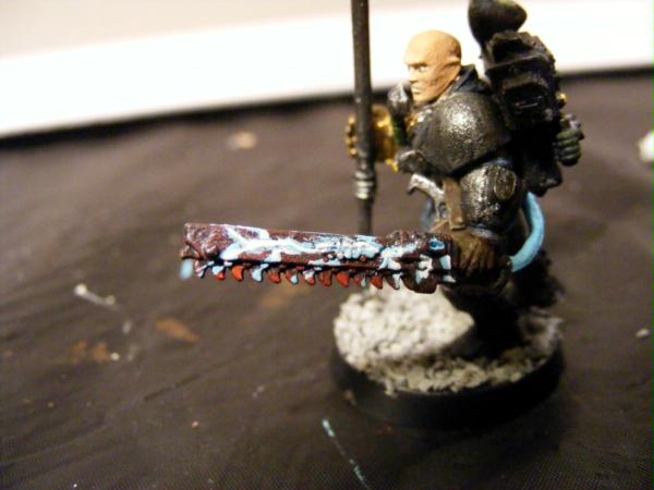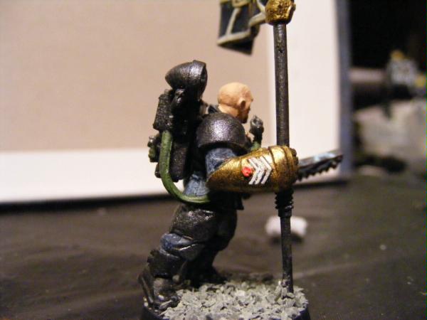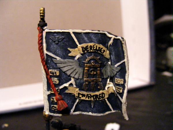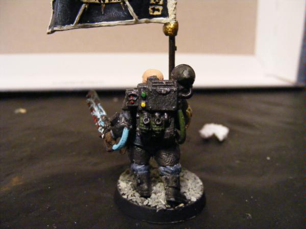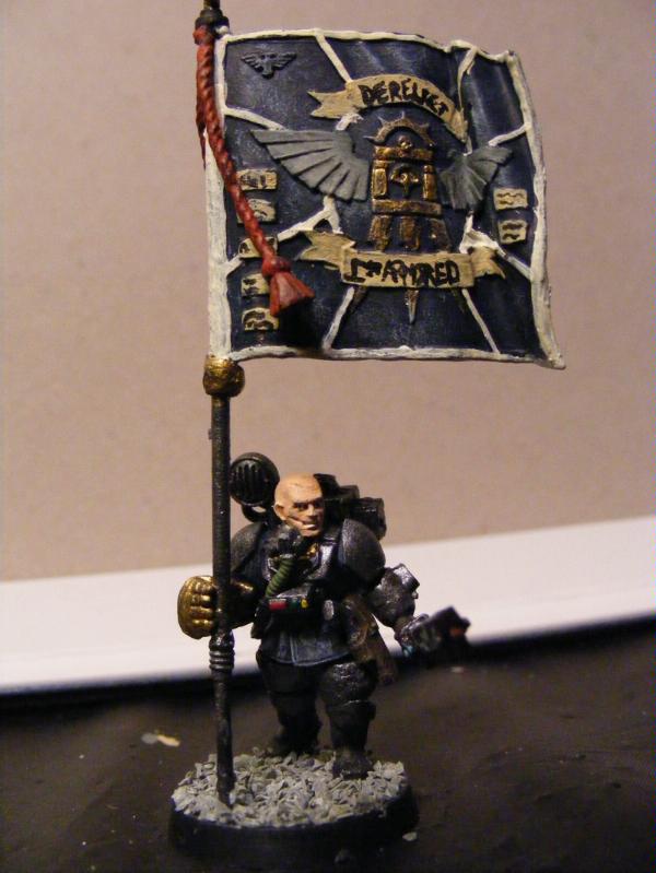 Yes, actually i do have some pictures. I built these guys for a campaign me and my girlfriend are doing. I am playing IG and she is playing tyranids. I, being a writer, have slaved over fluff. I enjoy a game of WH where you feel an attatchment to your models not just because you've painted them but because you've created their story. The Jeran Kell character that i play is named Philip "Midas" Turner. His nickname Midas came from the golden powerfist that he wields in battle. He is a courageous and outgoing soldier. He recieved the honor of carrying the Derelect 1st Armored standard after a bloody battle for the city gate. An ork boy managed to remove the city standard from its place atop one of the towers. Midas saw this and climbed the tower. When he reached the pinacle he took the Ork on single handedly and proved to be too quick for him. With the fever of victory in his lungs he bellowed to his comrades encouragement, all the while waving the banner of the Derelect capital city. This proved to be a turning point in the battle and Midas carried the banner for the next week until the 1st Armored achieved ultimate victory.