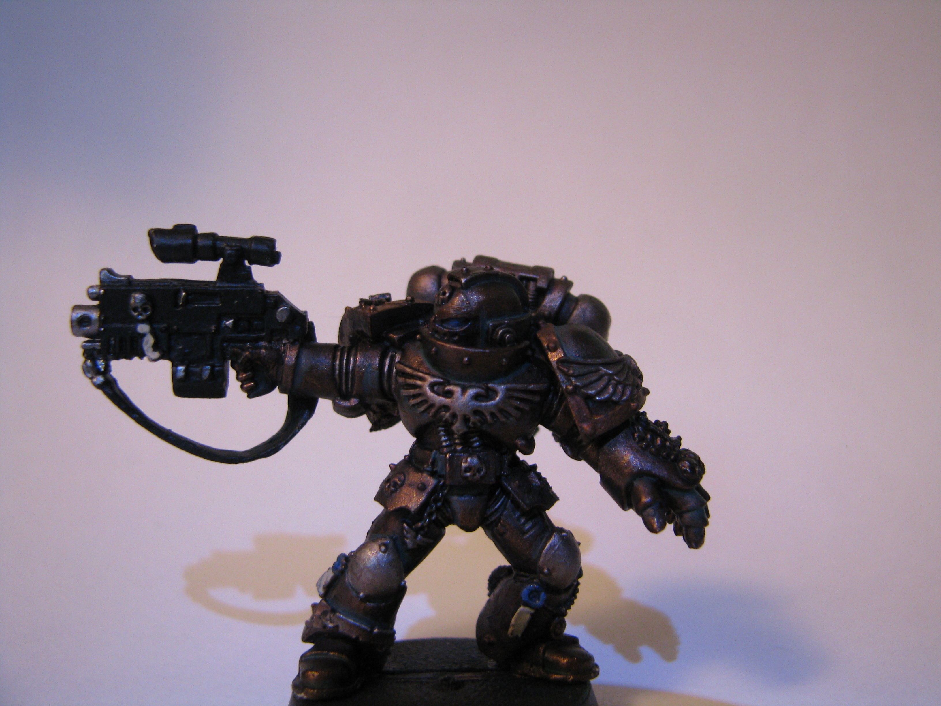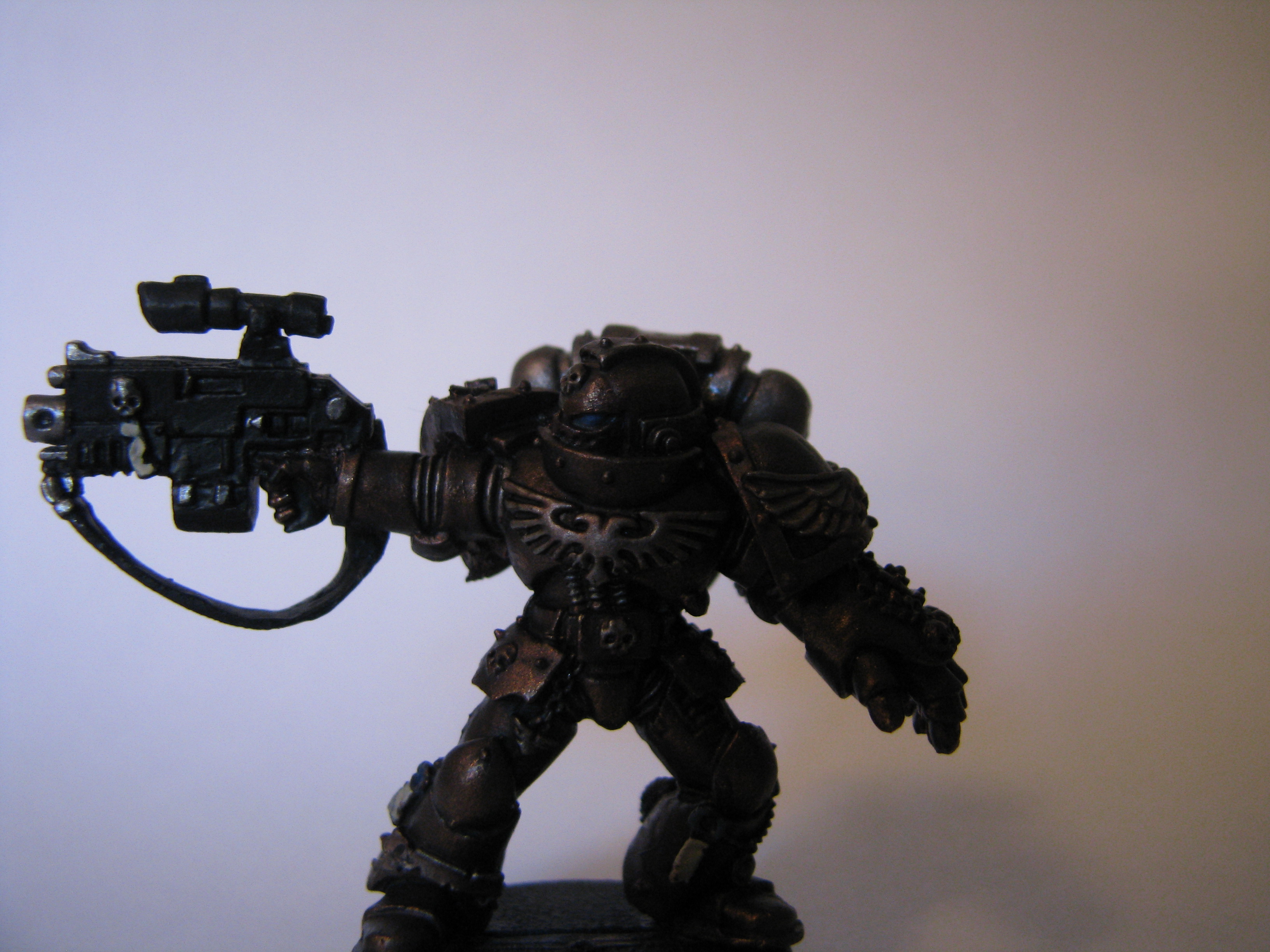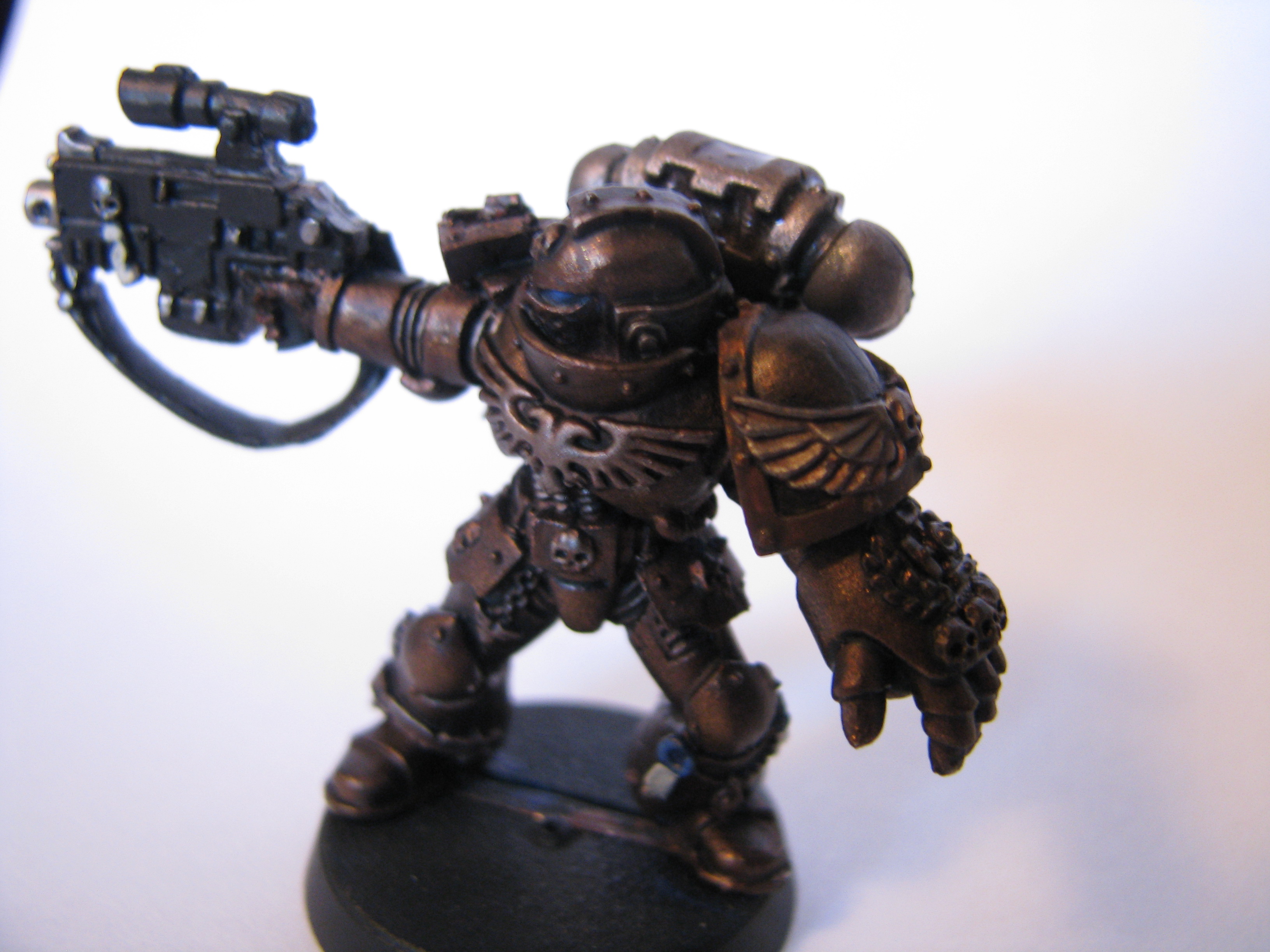 I think I'll call this a WIP for now, as I would like to see some more details popping out and give him a more old world bronze feel. I think that a green on the trim would look appropriate if I used like a hawk torquise and camo green mix or something, just to approximate oxidization without suggesting that this chapter neglects its armour. Overall, pretty pleased so far, but as always Comments and Critisism are welcome. More pics are available and I'd be happy to share the recipe upon request.