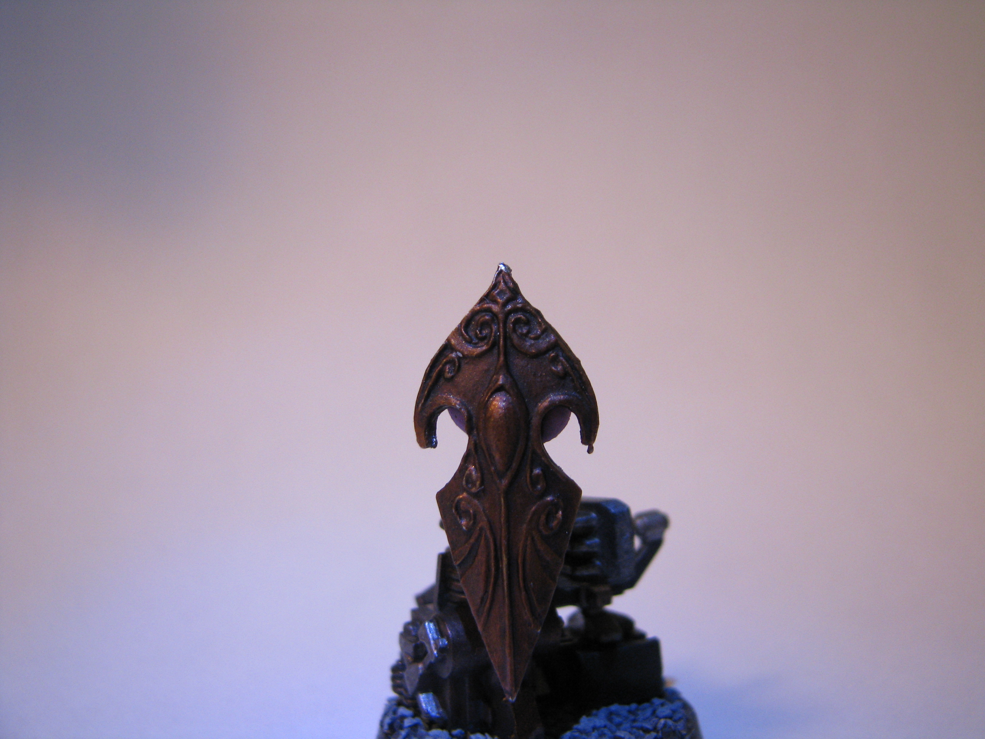 Tried a few new things. I've include pictures of a gold trim and more metallic looking knee pad, which I am partial to. Also, there is an oblective marker I pumped out a while ago, not sure what the one bit is supposed to be though. The sheild is a test bed for a new, more opulent base colour I've been working on. And finally, as per scotty khan's suggestion, some bone detailing. You might notice a bit of oxidization has been added to a few spots where water might settle.