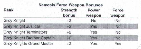 Right, well, got a question about what I believe is a fundamental aspect of a Daemonhunter army. I don't believe I fully understand the chart called the Nemesis Force Weapon bonus chart. (See Below)