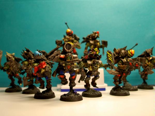 Alrighty, here is the other five of the Stormboyz, including the Nob, whom after painting, is now named 'Ork-Eye Moody!'