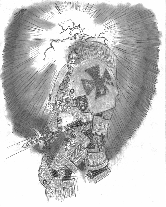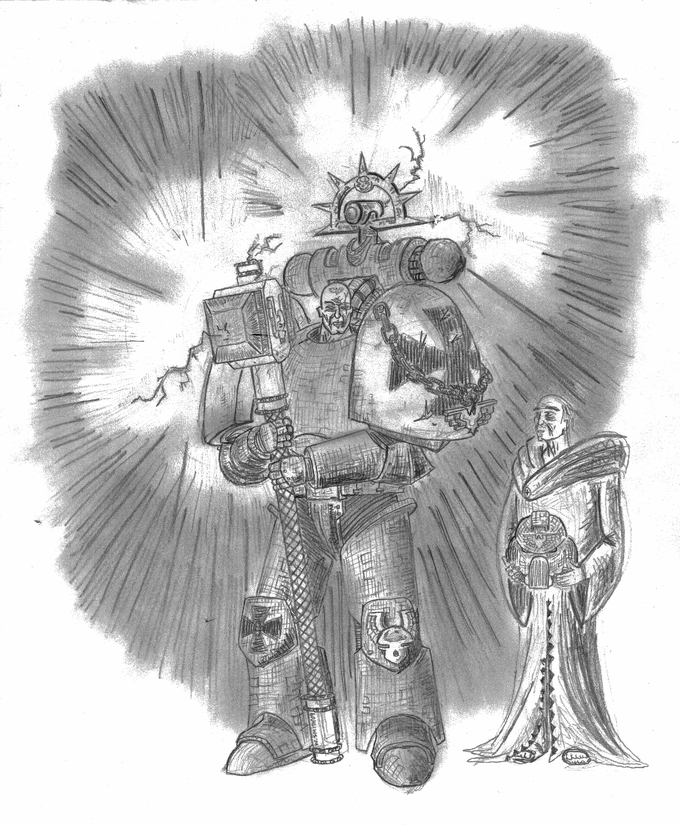 Well it's my first post ever, and I present in it some dilettante sketchings of mine. Obviously, I'm fascinated by the notion of 'Art Scale' marines. I mean, they're just too cool, right? So anyways, let me have your opinions on the sizes of these guys. Are they too beefy, or not pinheaded enough, or what? Also, I've always thought Terminator armor looked really goofy. The arms, especially in the miniature range, are way too high up in relation to the neck, IMO. Worse yet, the head is way too far forward in Terminator armor as well, so I tried to fix that too. My concept of it pushes the armor which encloses the power pack way back, which again looks a bit funny to me, so let me have any thoughts on how I might fix it! Would love to hear discussion on how, assuming we take a genetically engineered warrior zealot to be a possibility in the first place (Ha!), the Terminator armor could actually function with the anatomy of the human form. TALK AMONGST YOURSELVES!!! Thanks for the many months of satisfying 40k reading I've enjoyed on this site! My turn to finally contribute now!