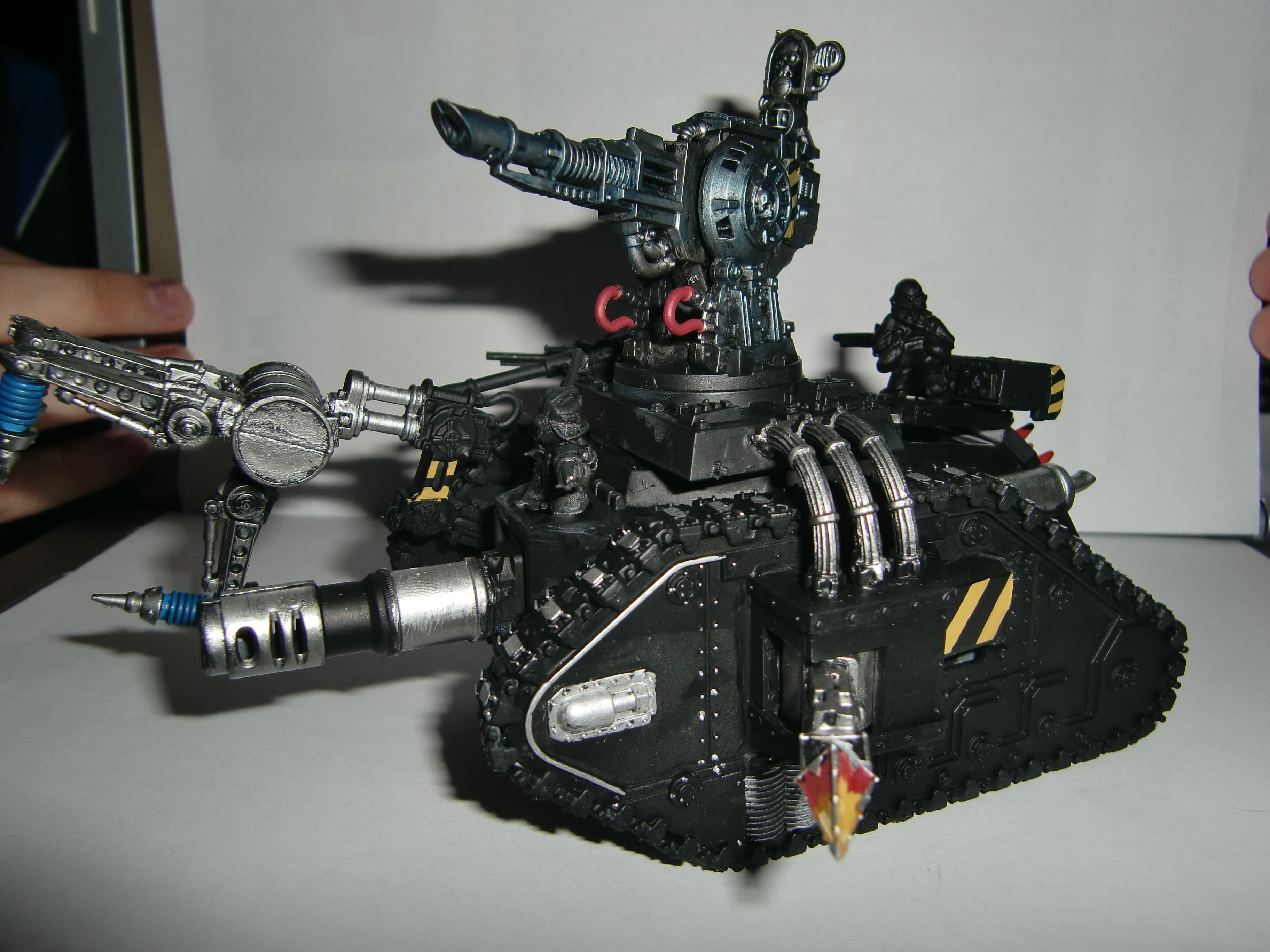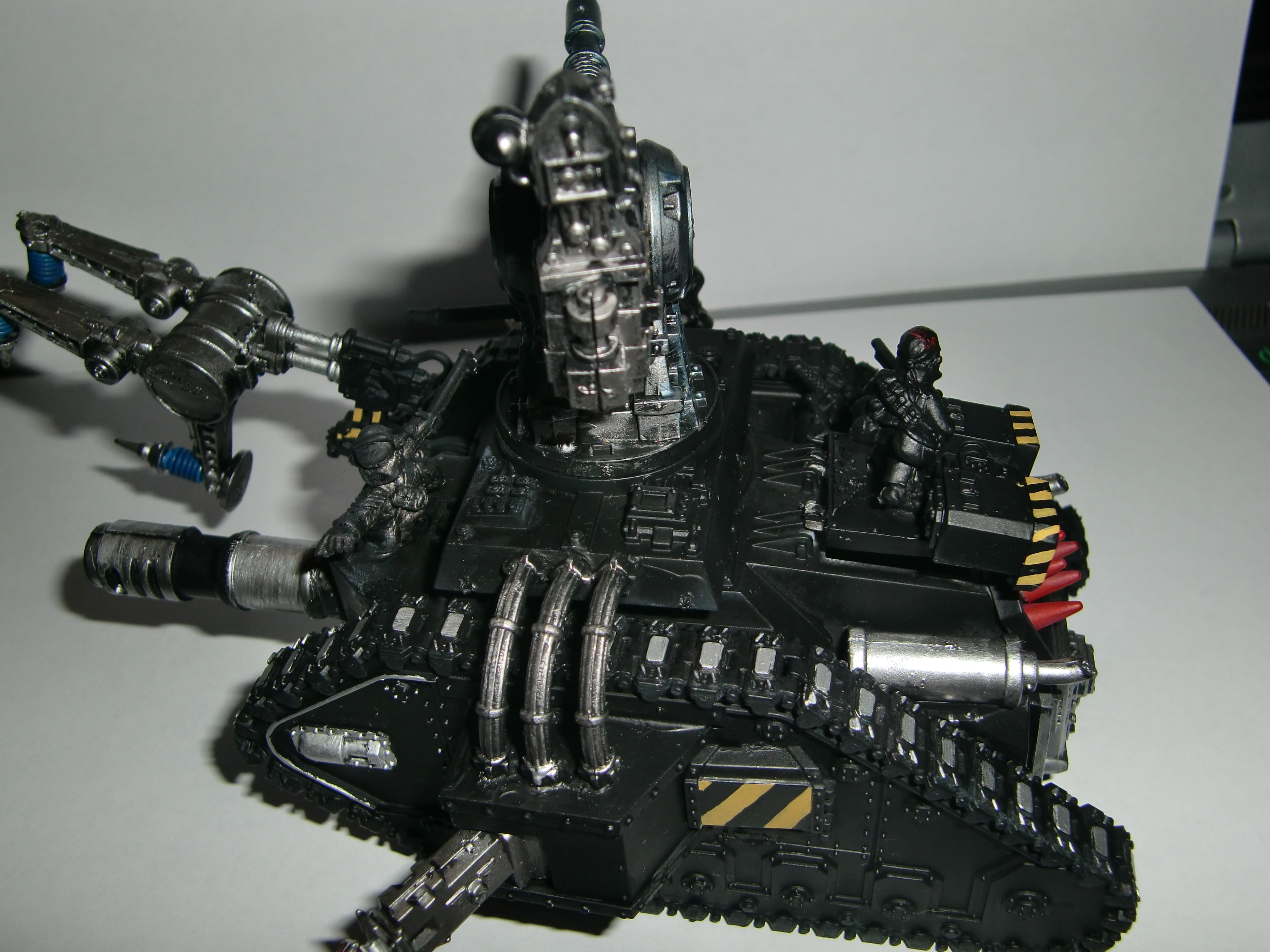 Very maniacal looking, like something out of an unorthodox tech-priest's garage, like the idea of the big tower on the top containing the main gun, and the claw is very well done, would like to see the painting finished.