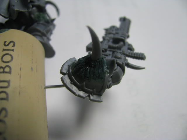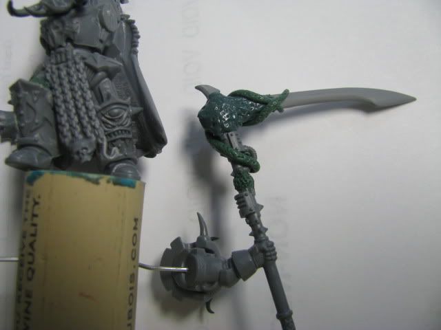 I didn't want to go overboard witth open sores and pustules on my DG, more of the time when nurgle energies just started to take over, such as his armor fusing to his body in places around the knee and head. Then the plague is most prominent on his right arm with the plague bringer and the energies flowing in it mingling with his body.